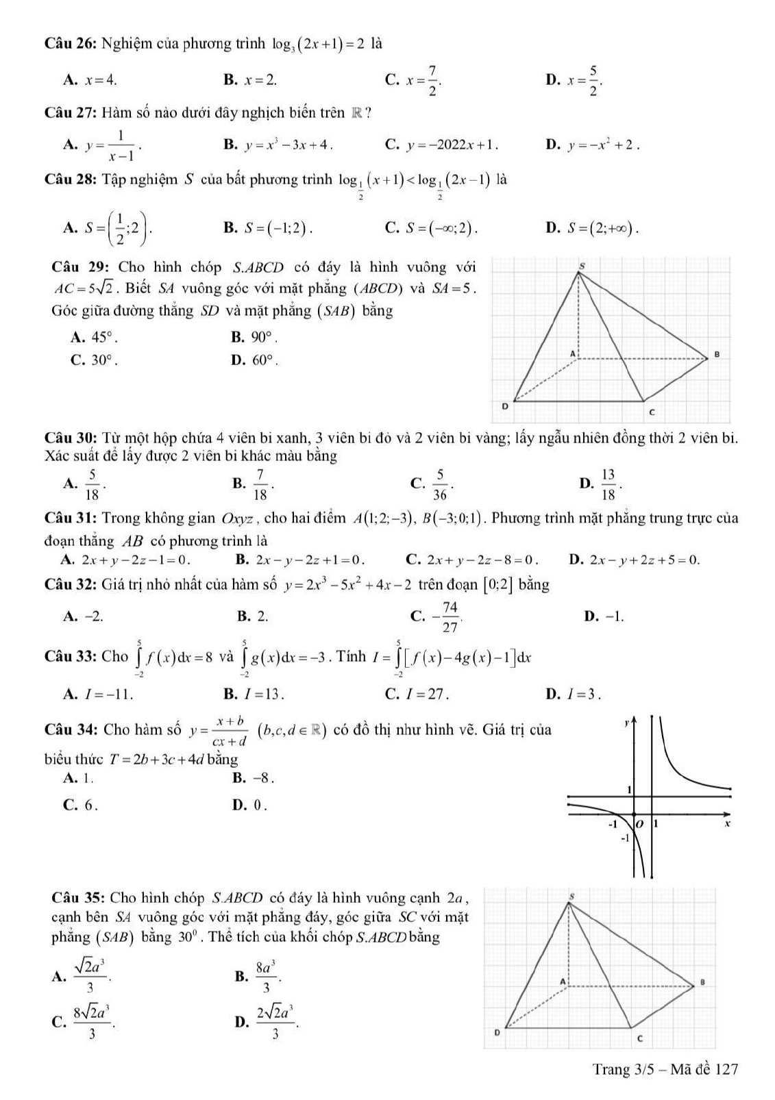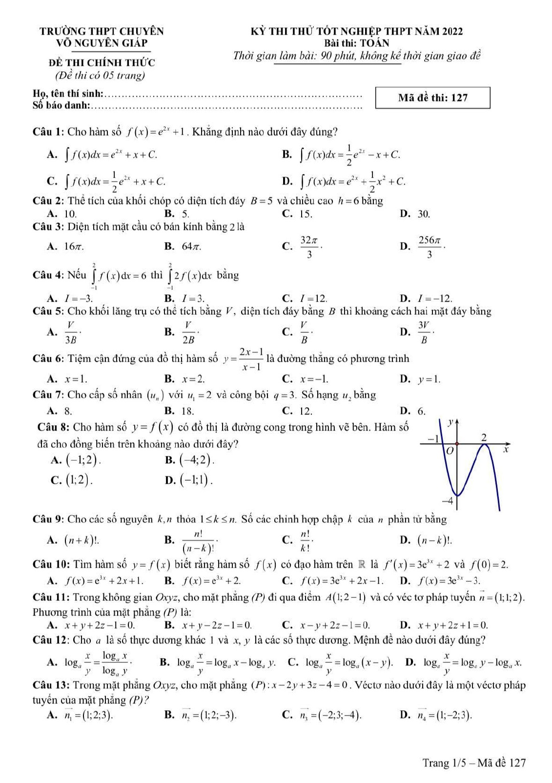 Đề thi thử tốt nghiệp THPT Quốc gia 2022 môn Toán trường THPT Chuyên Võ Nguyên Giáp, Quảng Bình