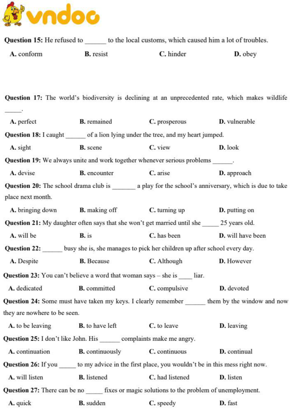 Tải trọn bộ nội dung đề thi và đáp án tại: Đề thi thử THPT Quốc Gia lần 1 năm 2019 môn Tiếng Anh trường THPT Chuyên Hà Tĩnh. Mời bạn đọc tham khảo thêm nhiều tài liệu ôn thi THPT Quốc Gia năm 2019 các môn khác như: Thi thpt Quốc gia môn Tiếng Anh 2019, Thi thpt Quốc gia môn Toán 2019, Thi thpt Quốc gia môn Văn 2019 ,.... có trên VnDoc.com.