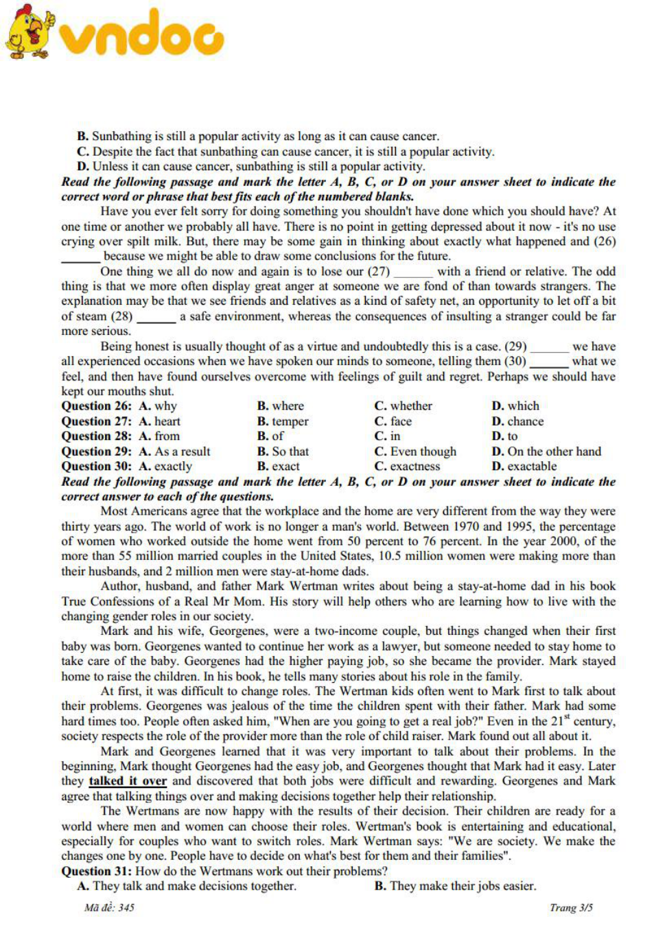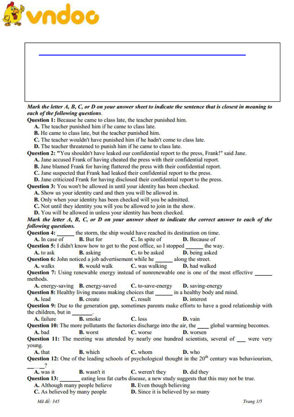 Xem thêm: Đề thi thử THPT Quốc Gia 2019 môn Anh có đáp án
