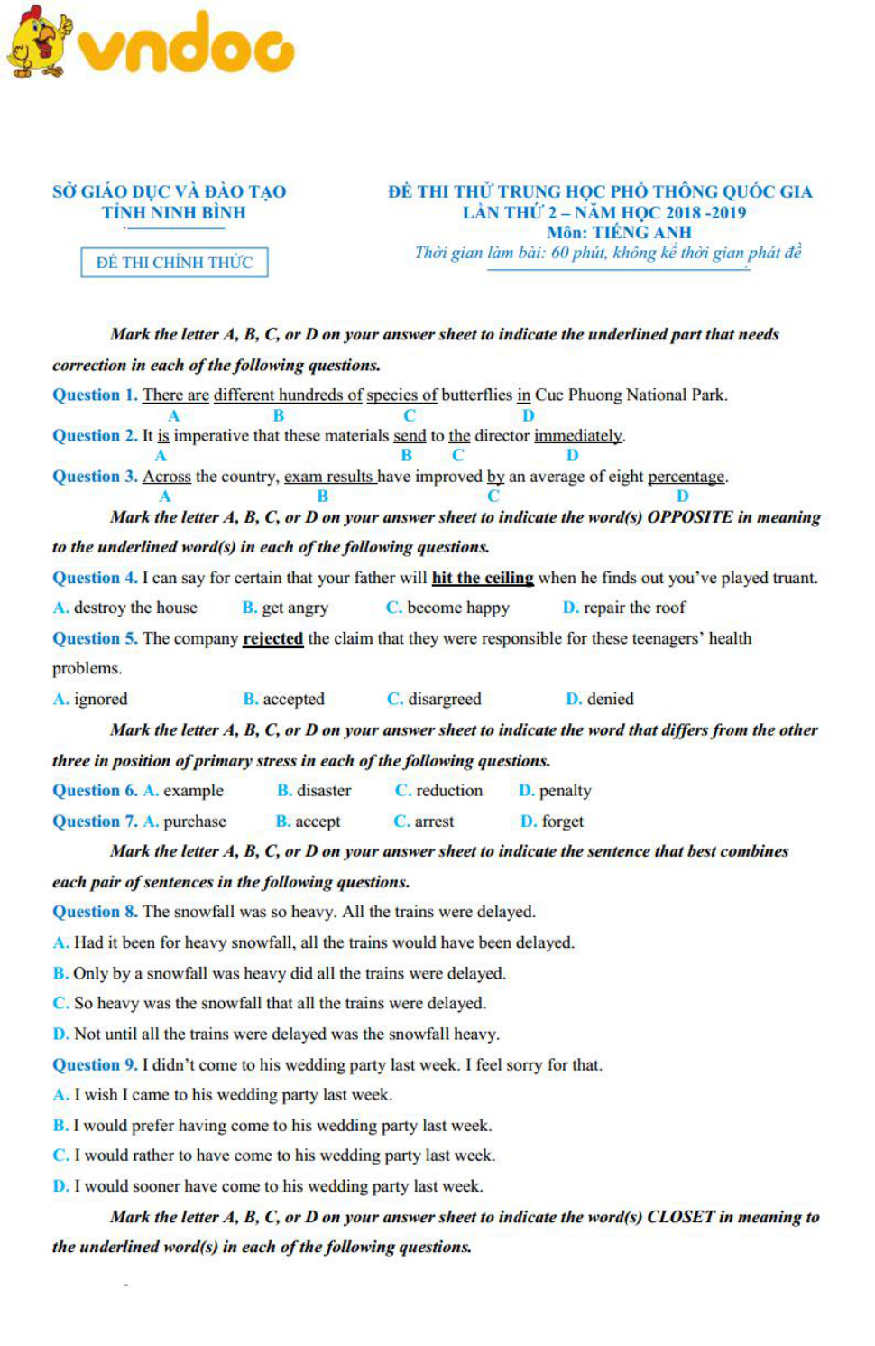 Tải đề thi và đáp án tại: Đề thi thử THPT Quốc Gia lần 2 năm 2019 môn Tiếng Anh sở GD - ĐT Ninh Bình. Mời bạn đọc tham khảo thêm nhiều tài liệu ôn thi THPT Quốc Gia năm 2019 các môn khác được cập nhật liên tục trên VnDoc.com như: Thi thpt Quốc gia môn Tiếng Anh 2019, Thi thpt Quốc gia môn Toán 2019, Thi thpt Quốc gia môn Văn 2019 ,....