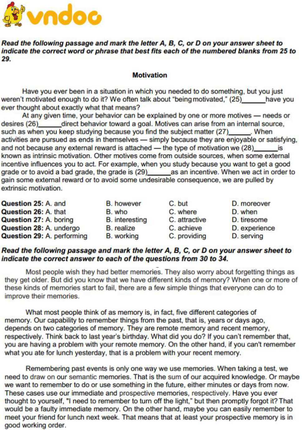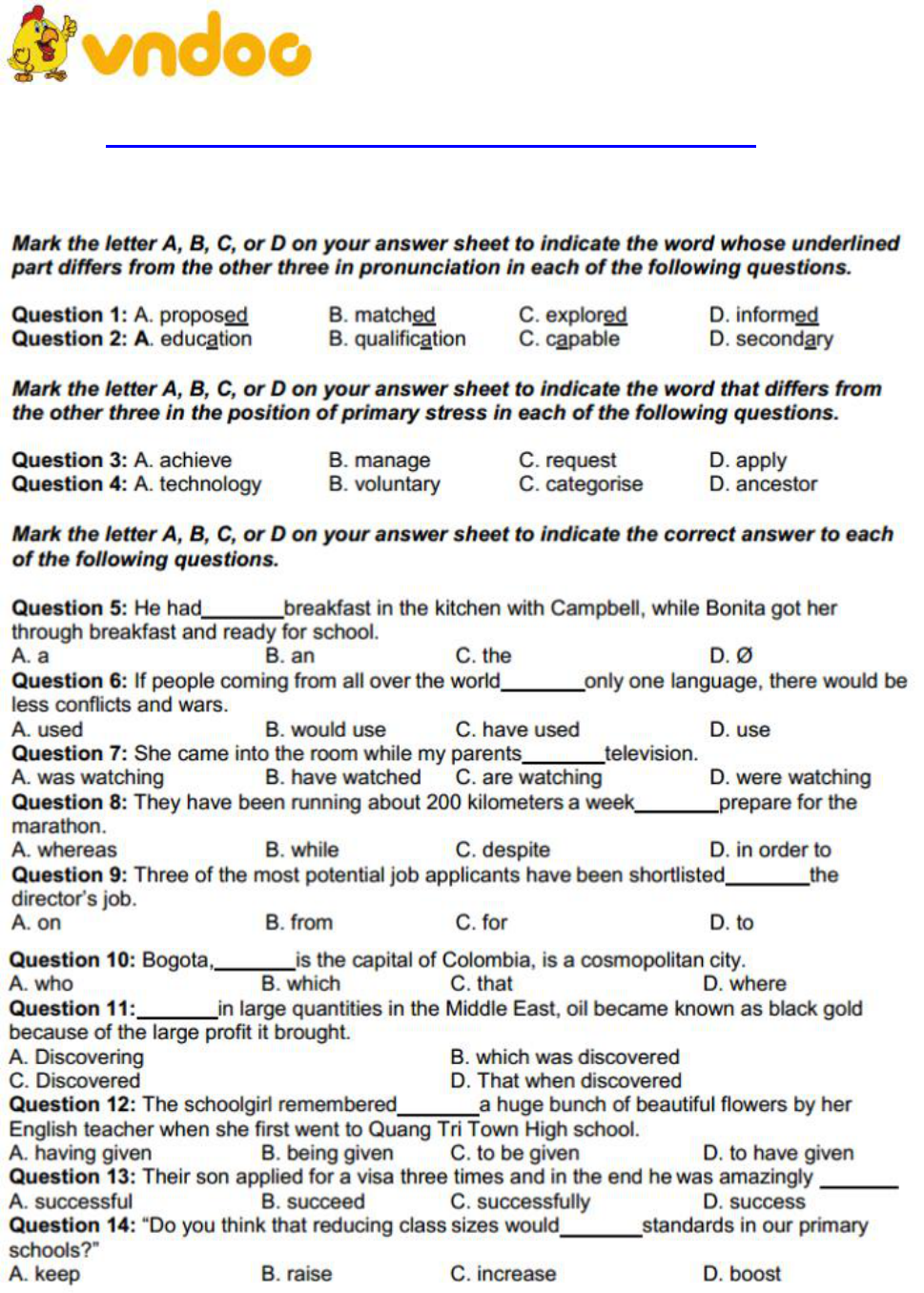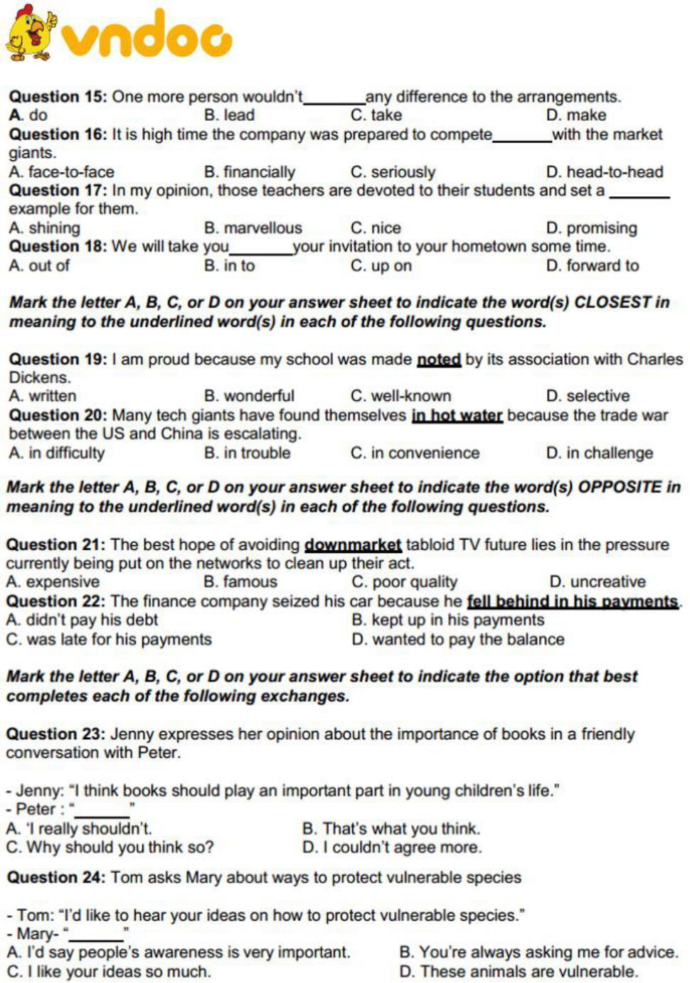 Tải trọn bộ đề thi và đáp án tại: Đề thi thử THPT Quốc Gia lần 2 năm 2019 môn Tiếng Anh trường THPT Thị xã Quảng Trị. Mời bạn đọc tham khảo thêm nhiều tài liệu ôn thi THPT Quốc Gia năm 2019 các môn khác như: Thi thpt Quốc gia môn Tiếng Anh 2019, Thi thpt Quốc gia môn Toán 2019, Thi thpt Quốc gia môn Văn 2019 ,.... có trên VnDoc.com.