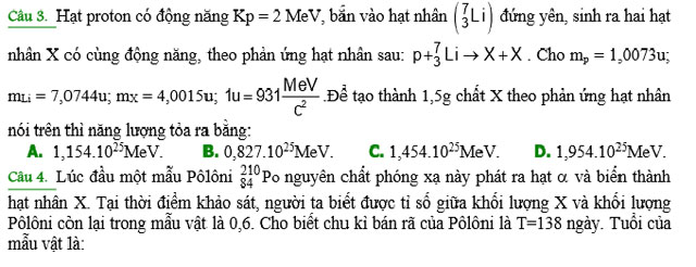 Câu 2: Khi êlectron ở quỹ đạo dừng thứ n thì năng lượng của nguyên tử hiđrô được tính theo công thức En = -13,6/ n2 (eV) (n = 1, 2, 3,…). Khi êlectron trong nguyên tử hiđrô chuyển từ quỹ đạo dừng n = 3 sang quỹ đạo dừng n = 2 thì nguyên tử hiđrô phát ra phôtôn ứng với bức xạ có bước sóng bằng