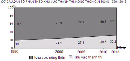 - Sự chuyển dịch:Từ 1990 đến 2013, trong vòng 23 năm: Cơ cấu dân số phân theo khu vực có sự thay đổi theo hướng: giảm dần tỉ trọng dân nông thôn,tăng dần tỉ trọng dân thành thị, cụ thể là: