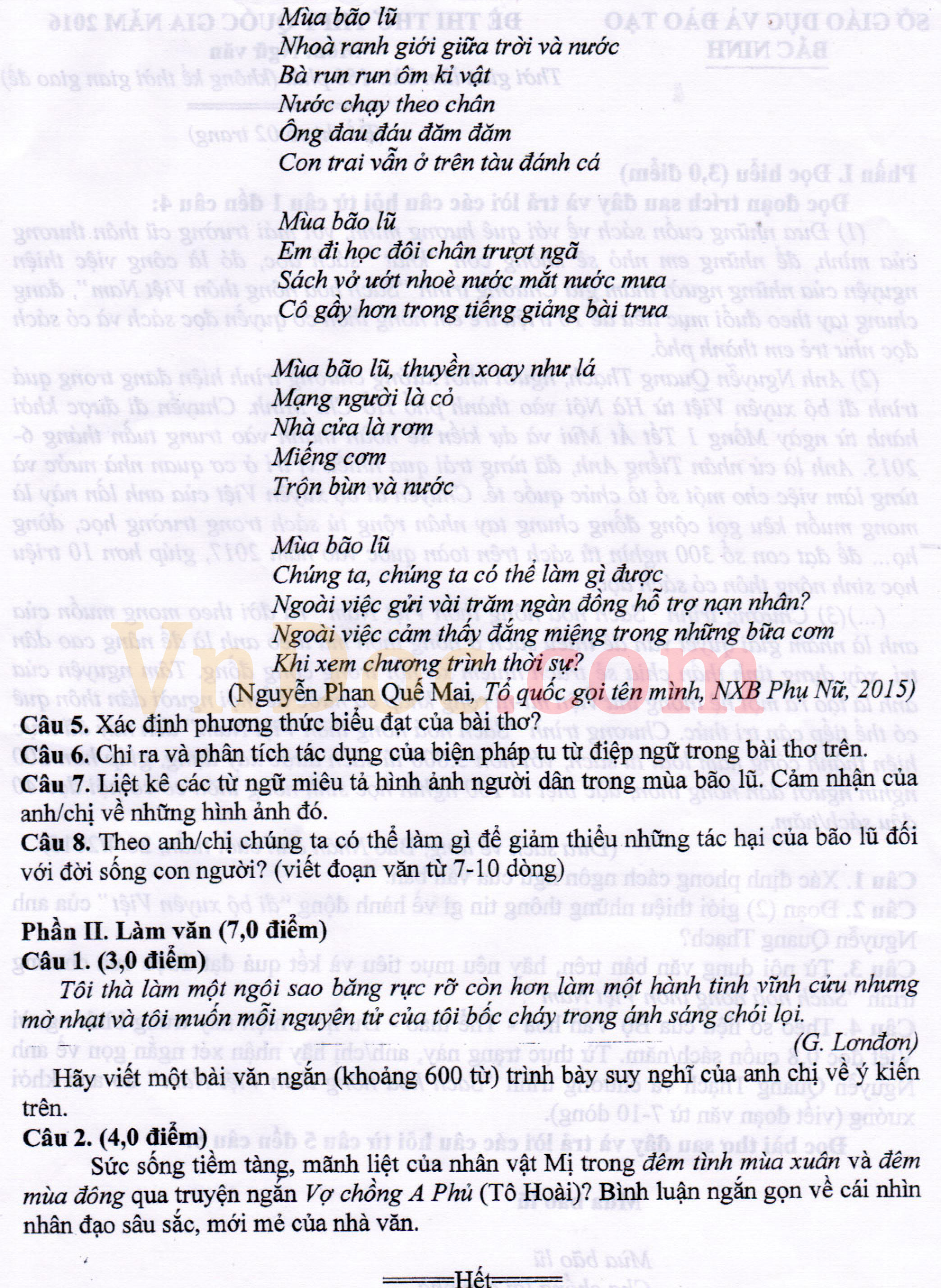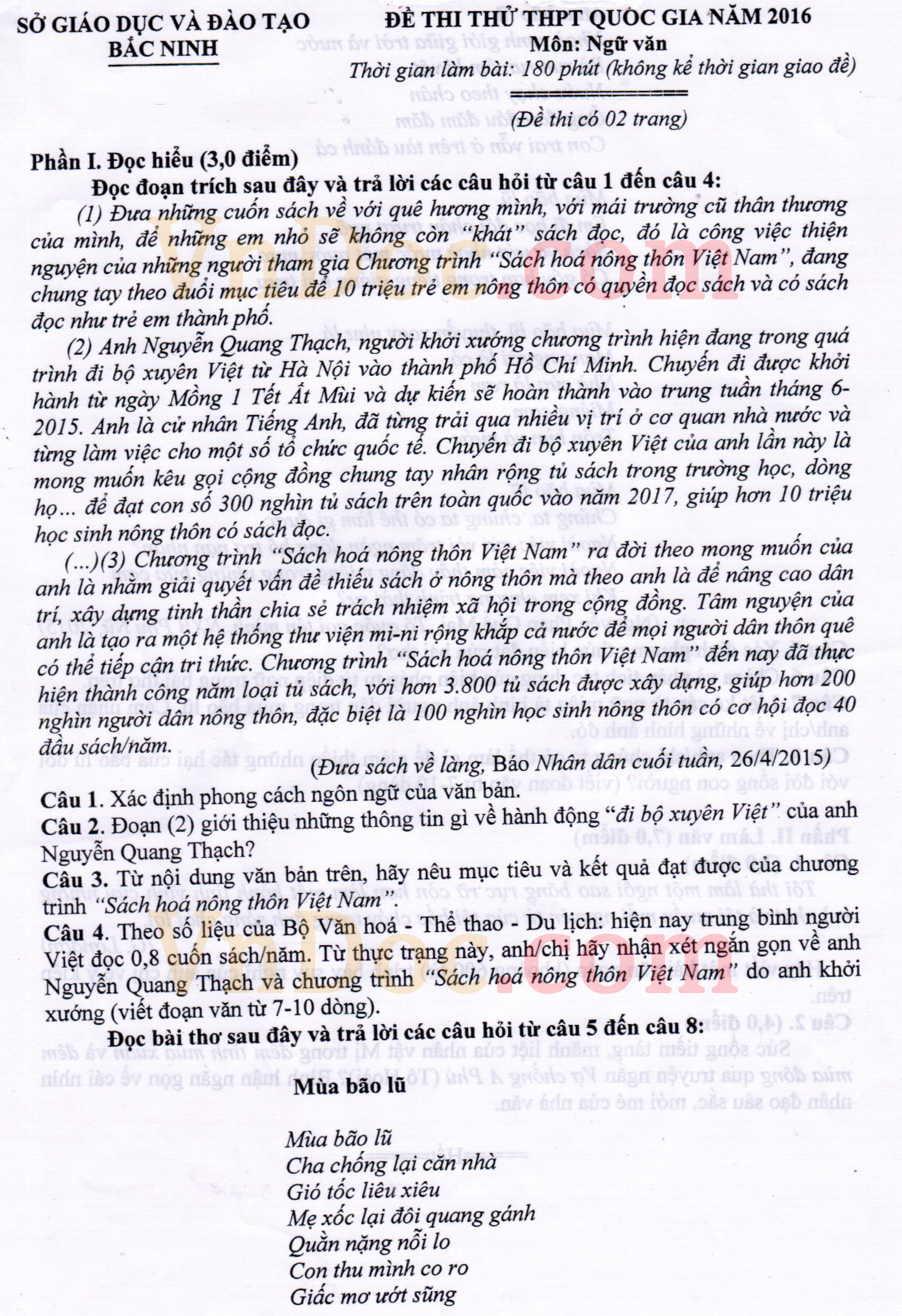 Đề thi thử THPT Quốc gia môn Ngữ văn năm 2016 tỉnh Bắc Ninh