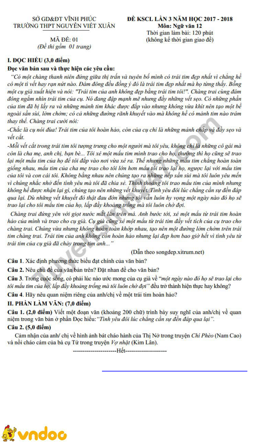 Đề thi thử THPT quốc gia môn Ngữ văn năm 2018 trường THPT Nguyễn Viết Xuân - Vĩnh Phúc (Lần 3)