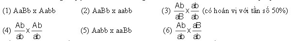 Nếu không có đột biến và các loại giao tử được thụ tinh với xác suất như nhau, các loại hợp tử có tỉ lệ sống sót như nhau thì trong 6 phép lai nói trên, số lượng phép lai mà đời con có 4 loại kiểu hình với tỉ lệ 1:1:1:1 là