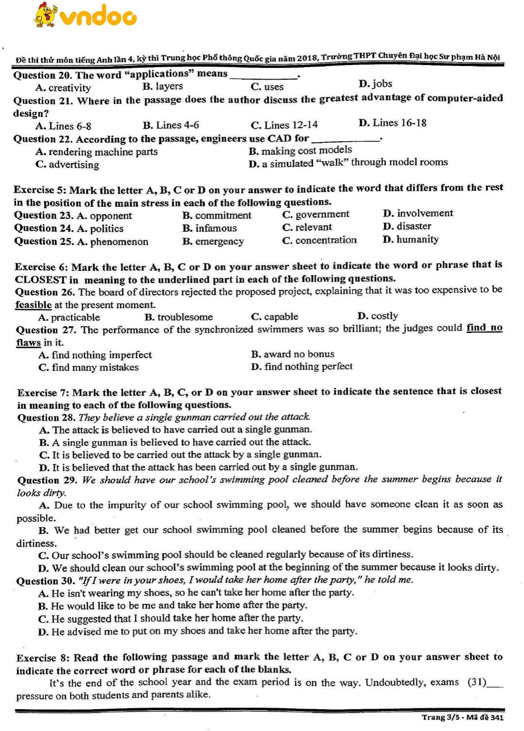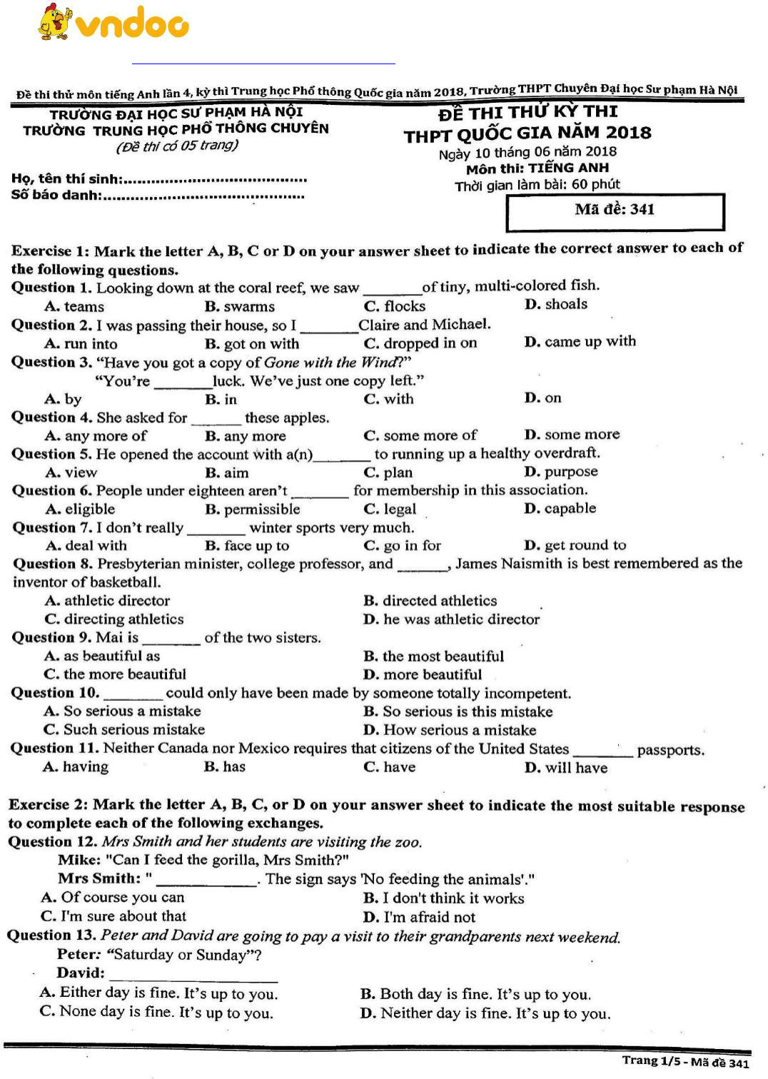 Đề thi thử THPT Quốc gia môn tiếng Anh năm 2018 trường THPT Chuyên ĐHSP Hà Nội lần 4 có đáp án