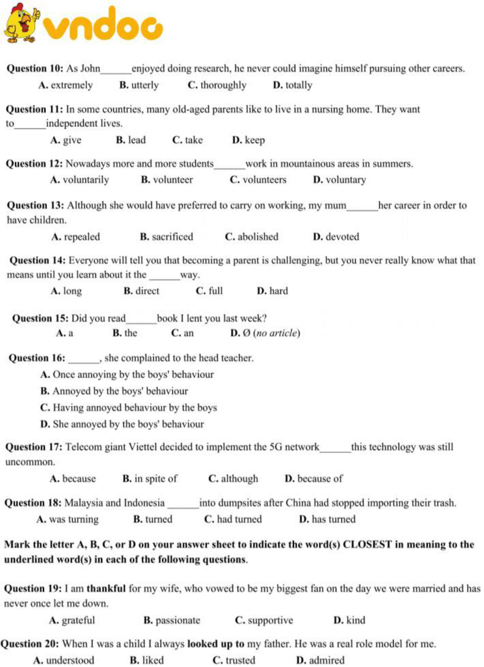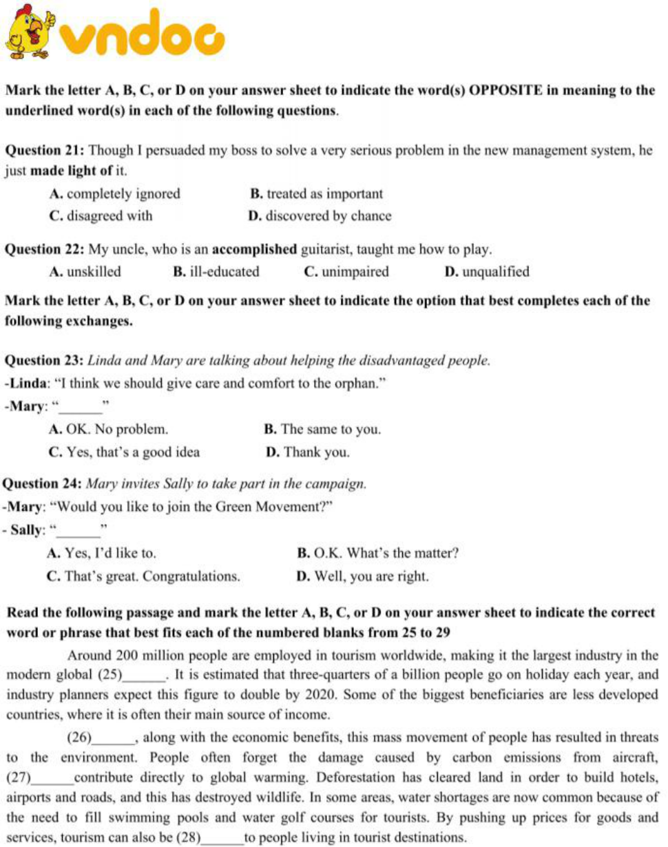 Đề ôn thi tốt nghiệp THPT 2019 môn Tiếng Anh của sở GD - ĐT Bình Dương có đáp án nằm trong bộ đề thi THPT Quốc gia môn Tiếng Anh năm 2019 do VnDoc.com sưu tầm và đăng tải. Đề thi môn Tiếng Anh có cấu trúc giống với đề thi minh họa của bộ GD&ĐT giúp học sinh lớp 12 rèn luyện kỹ năng làm bài thi hiệu quả.