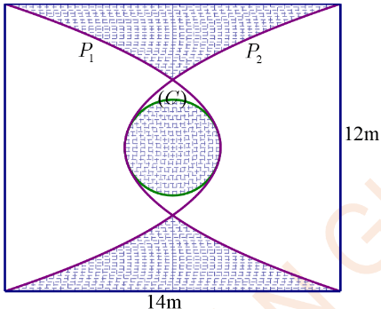 \((C)\) là đường tròn có tâm trùng với tâm của mảnh sân và lần lượt có duy nhất một điểm chung với các parabol đó (tham khảo hình vẽ biết phần gạch đậm là phần lát gạch). Chi phí cho phần lát gạch là
