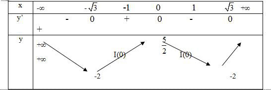 - Cực trị. Hàm số đạt cực đại tại x = 0, yCĐ = y(0) = 5/2. Hàm số đạt cực tiểu tại x = ±√3, yCT = y(±√3) = - 2.