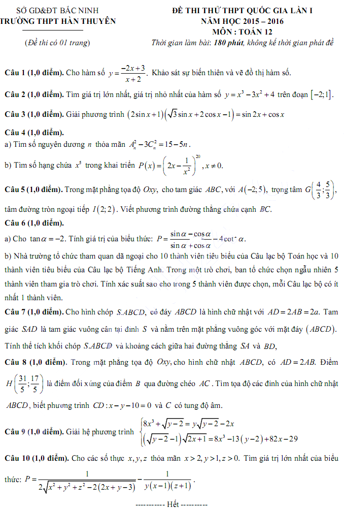 Đề thi thử THPT Quốc gia môn Toán lần 1 năm 2016 trường THPT Hàn Thuyên, Bắc Ninh