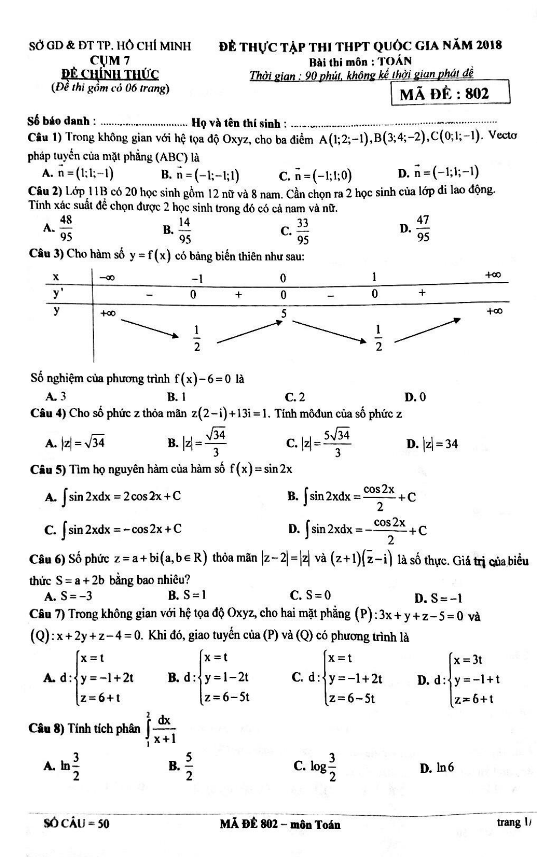 Đề thi thử THPT quốc gia môn Toán năm 2018 cụm 7 - TP. Hồ Chí Minh