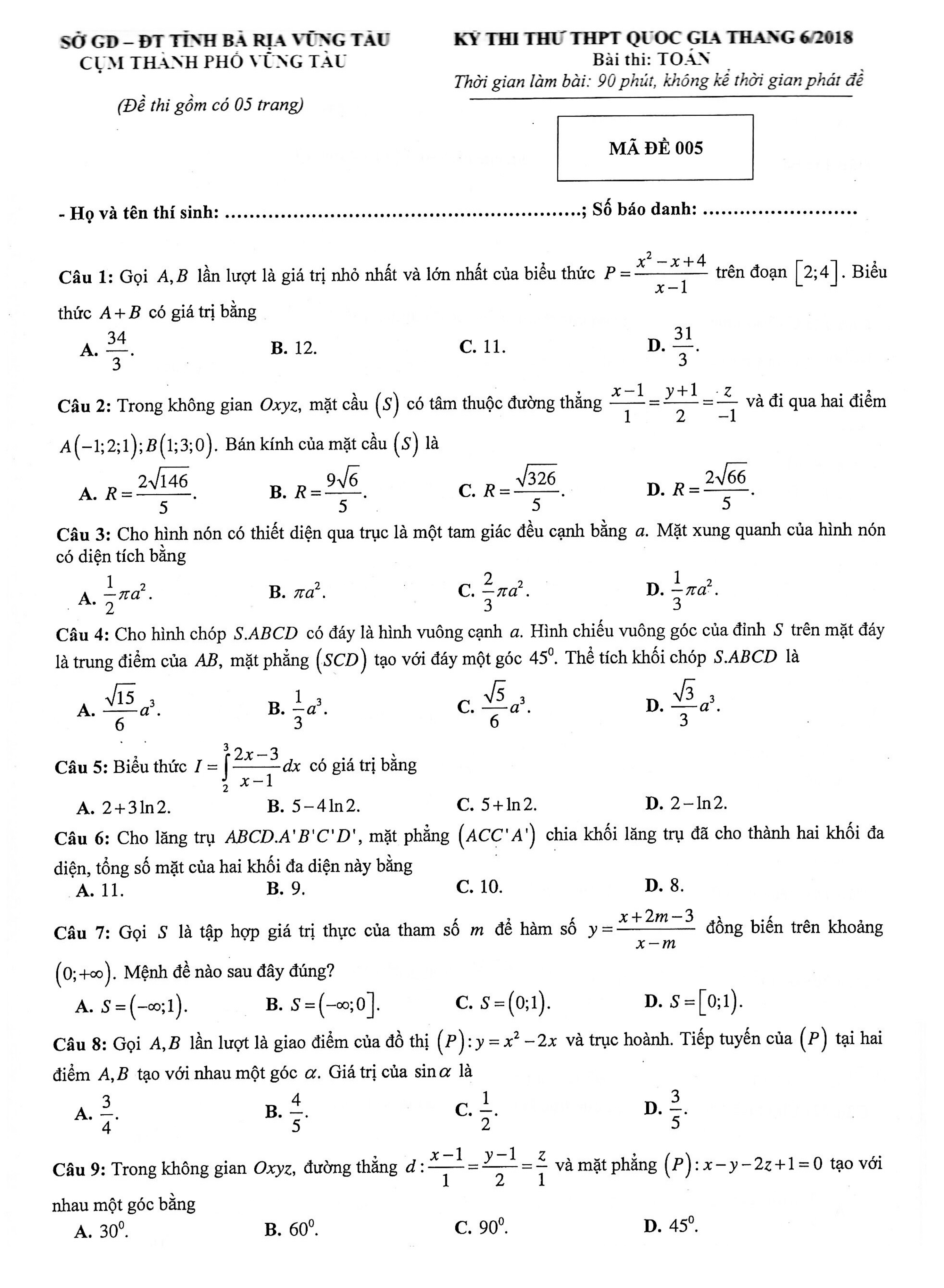 Đề thi thử THPT quốc gia môn Toán năm 2018 cụm thành phố Vũng Tàu