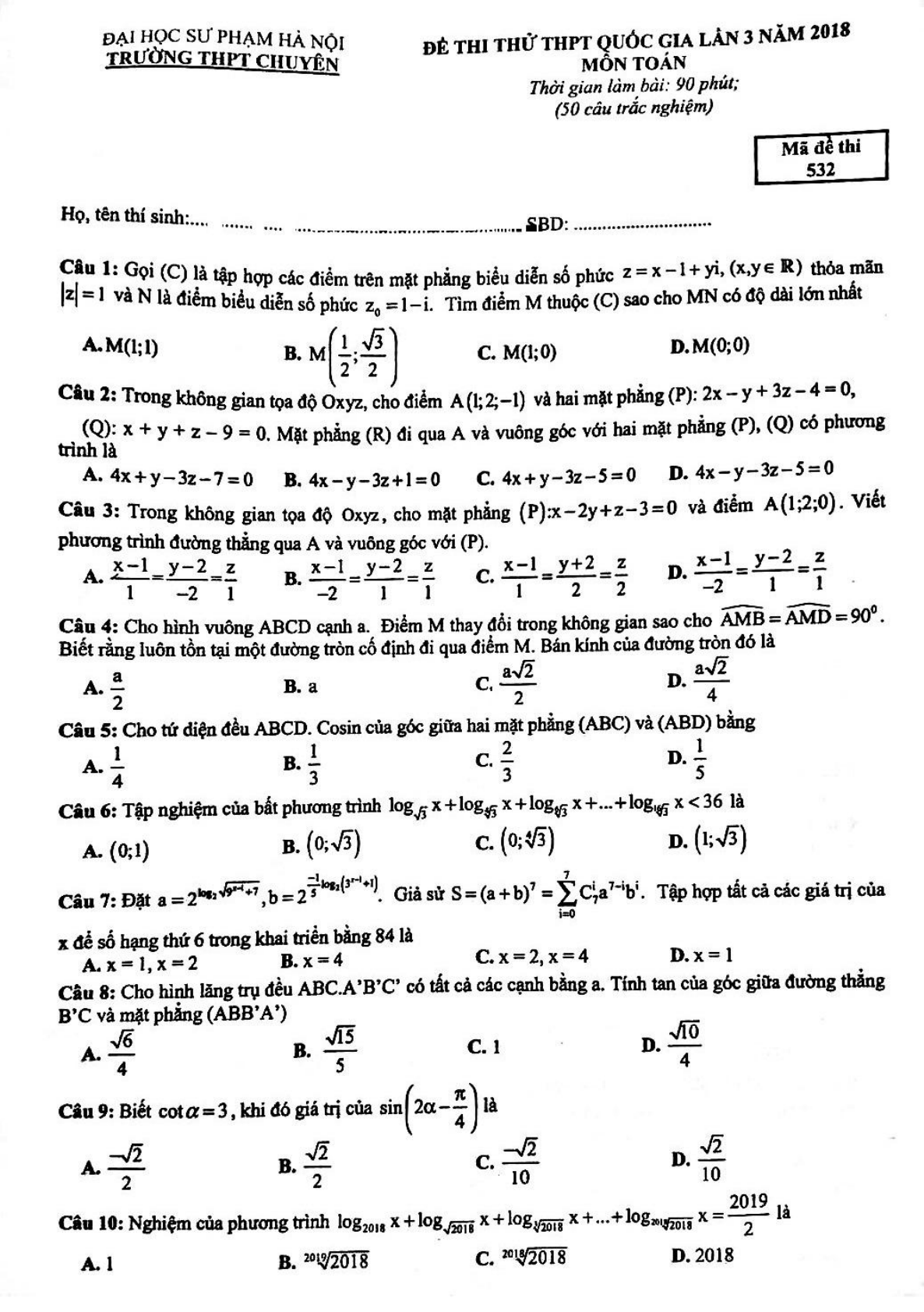 Đề thi thử THPT quốc gia môn Toán năm 2018 trường THPT chuyên ĐH Sư Phạm Hà Nội (Lần 3)