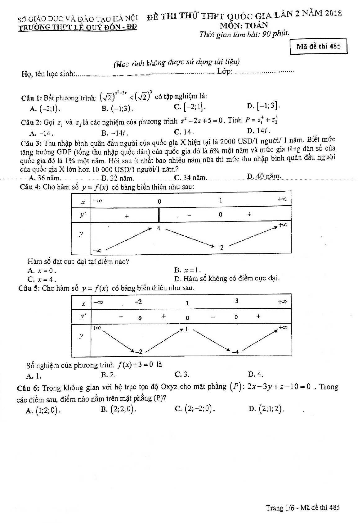 Đề thi thử THPT quốc gia môn Toán năm 2018 trường THPT Lê Quý Đôn - Hà Nội (Lần 2)
