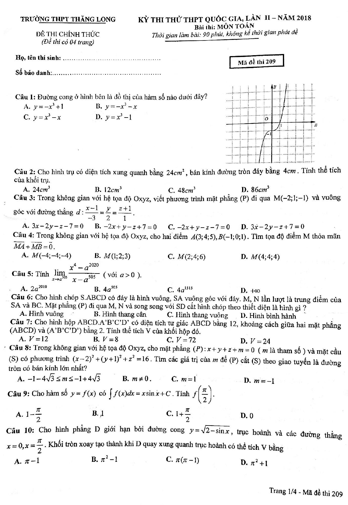 Đề thi thử THPT quốc gia môn Toán năm 2018 trường THPT Thăng Long - Hà Nội (Lần 2)
