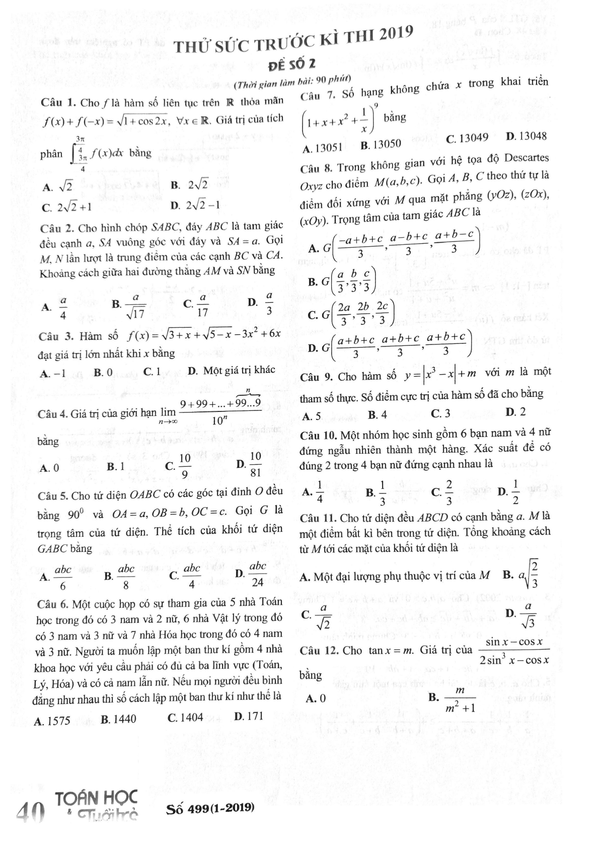 Đề thi thử THPT Quốc gia môn Toán năm 2019 - Toán Học Tuổi Trẻ đề số 2