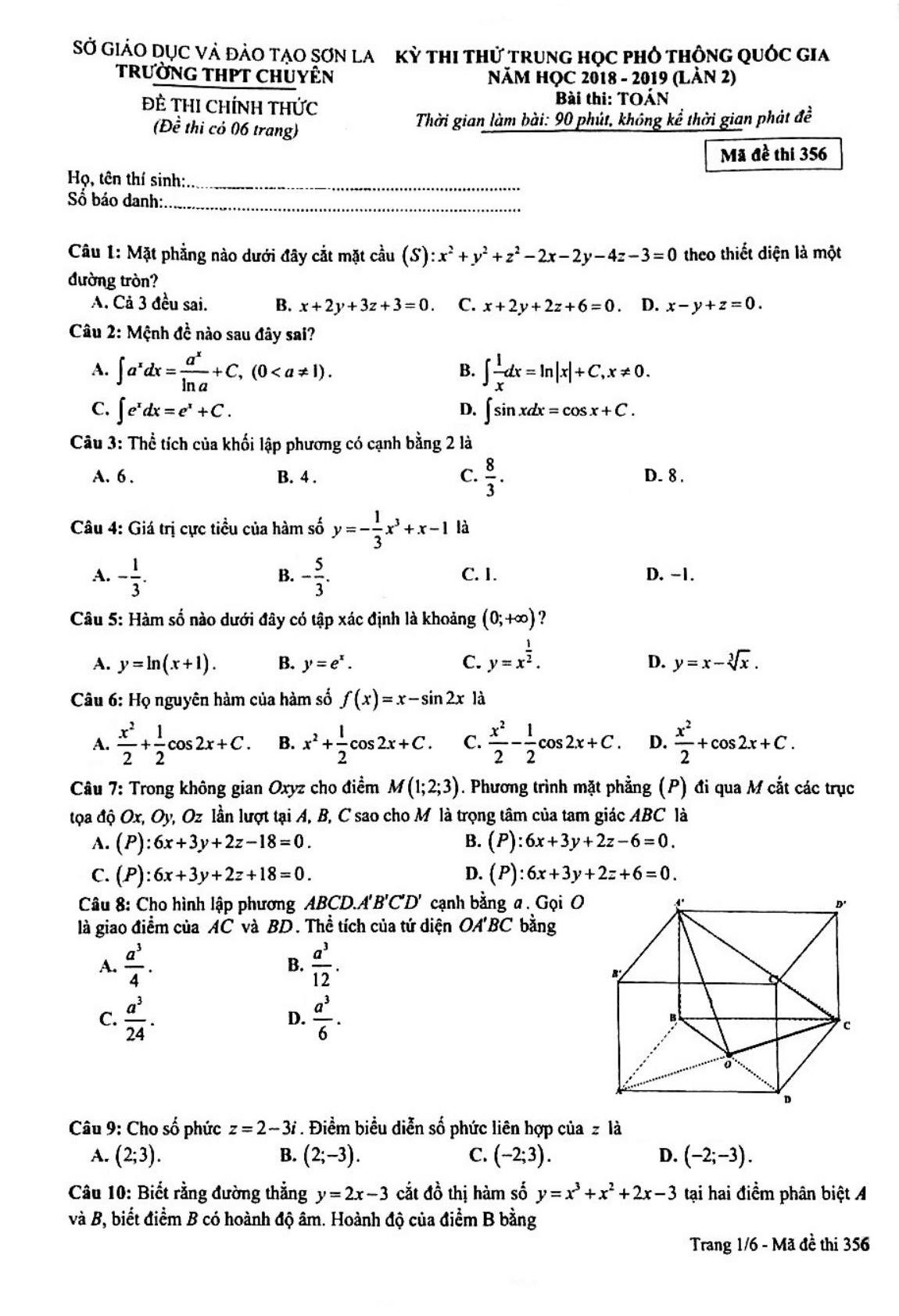 Đề thi thử THPT Quốc gia môn Toán năm 2019 trường THPT Chuyên Sơn La lần 2