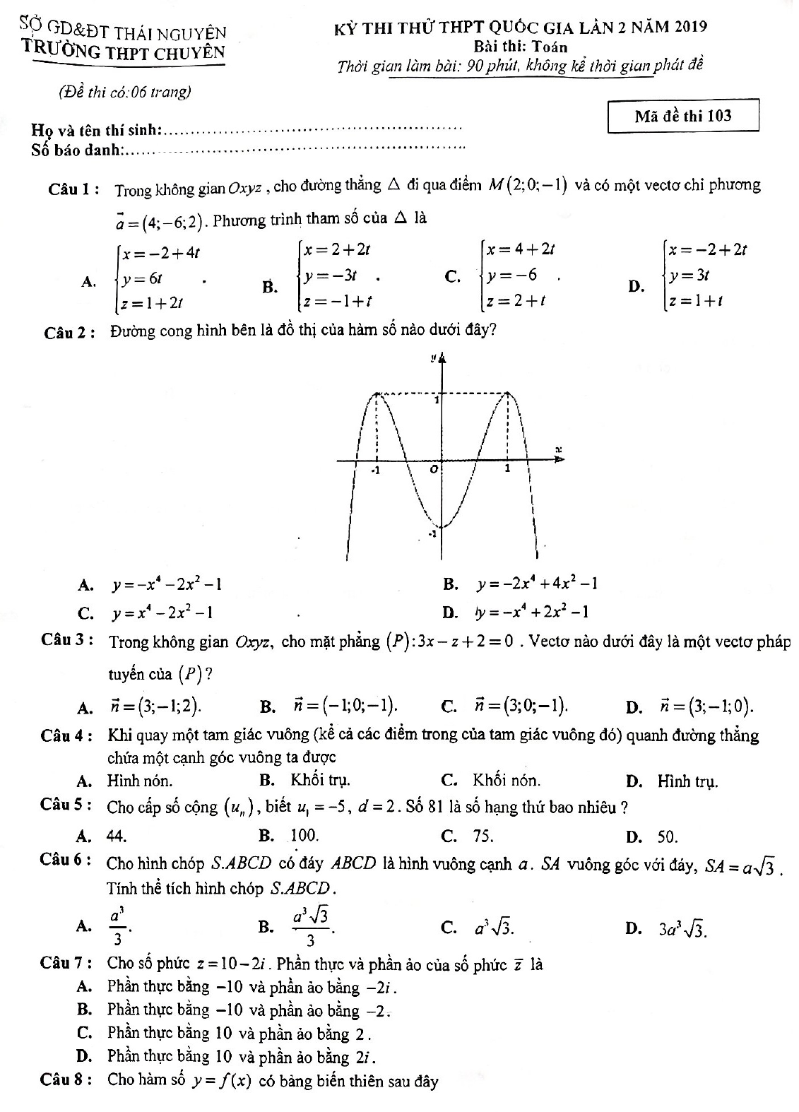 Đề thi thử THPT Quốc gia môn Toán năm 2019 trường THPT Chuyên Thái Nguyên lần 2