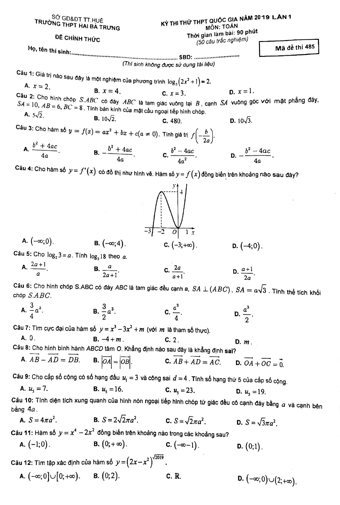 Đề thi thử THPT Quốc gia môn Toán năm 2019 trường THPT Hai Bà Trưng - TT. Huế lần 1