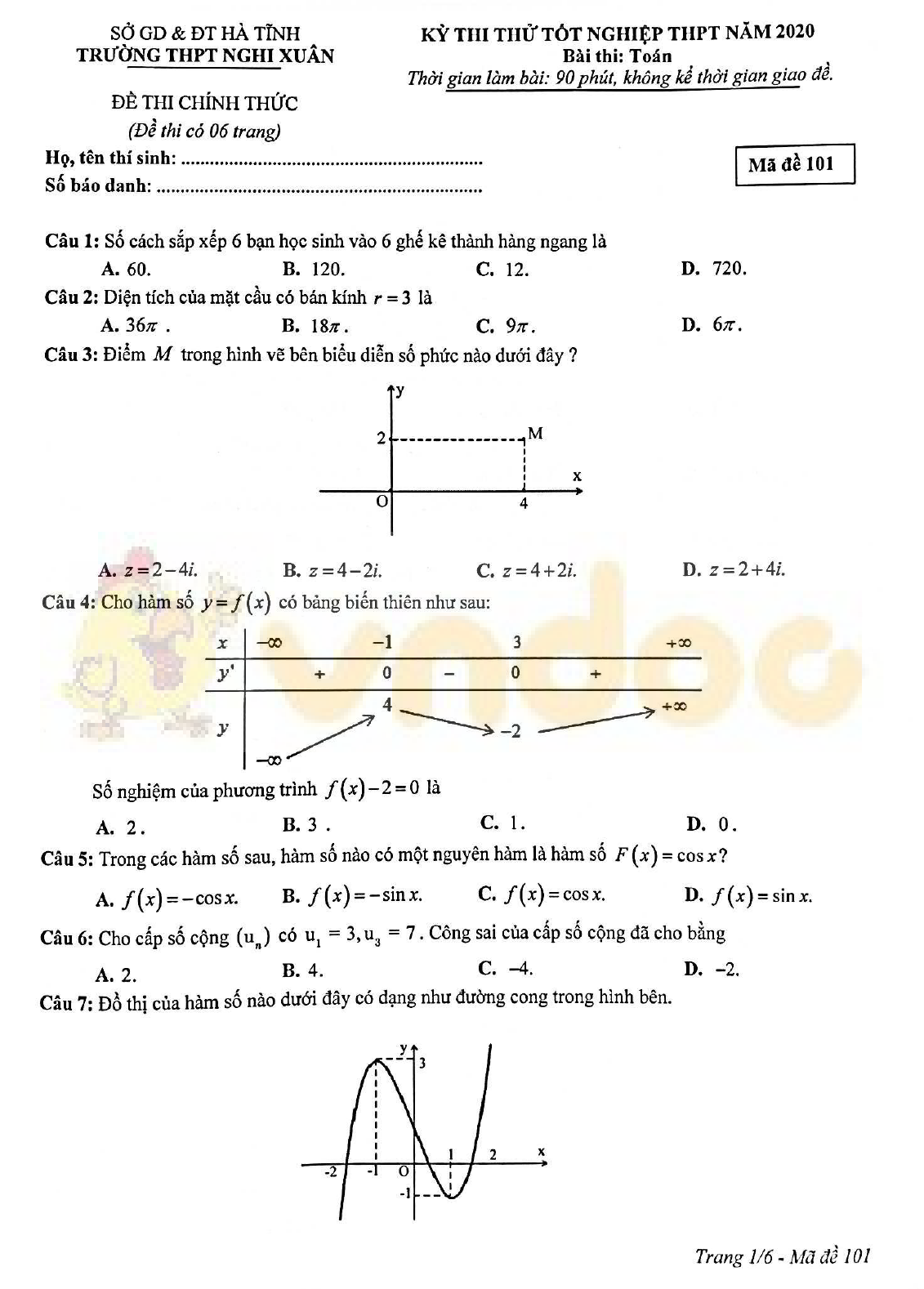 Đề thi thử tốt nghiệp THPT Quốc gia môn Toán năm 2020 lần 1 trường THPT Nghi Xuân, Hà Tĩnh
