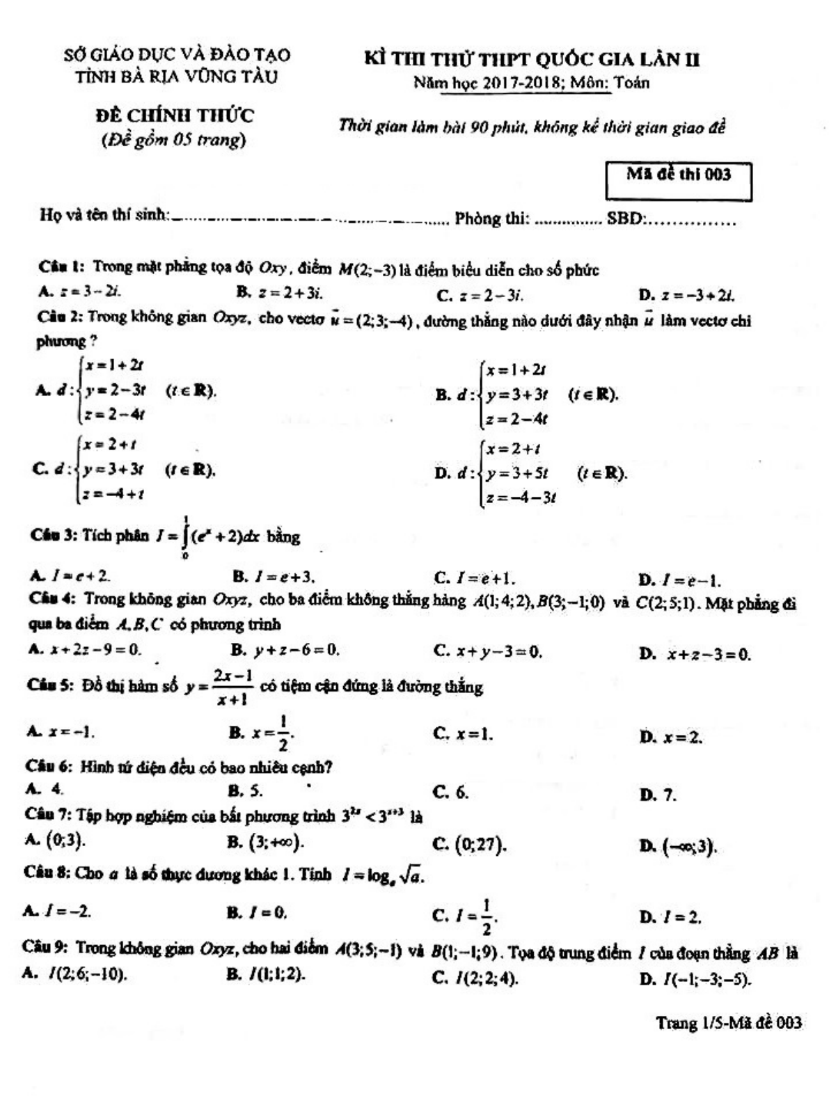 Đề thi thử THPT quốc gia môn Toán năm học 2017 - 2018 Sở GD&ĐT Bà Rịa - Vũng Tàu (Lần 2)