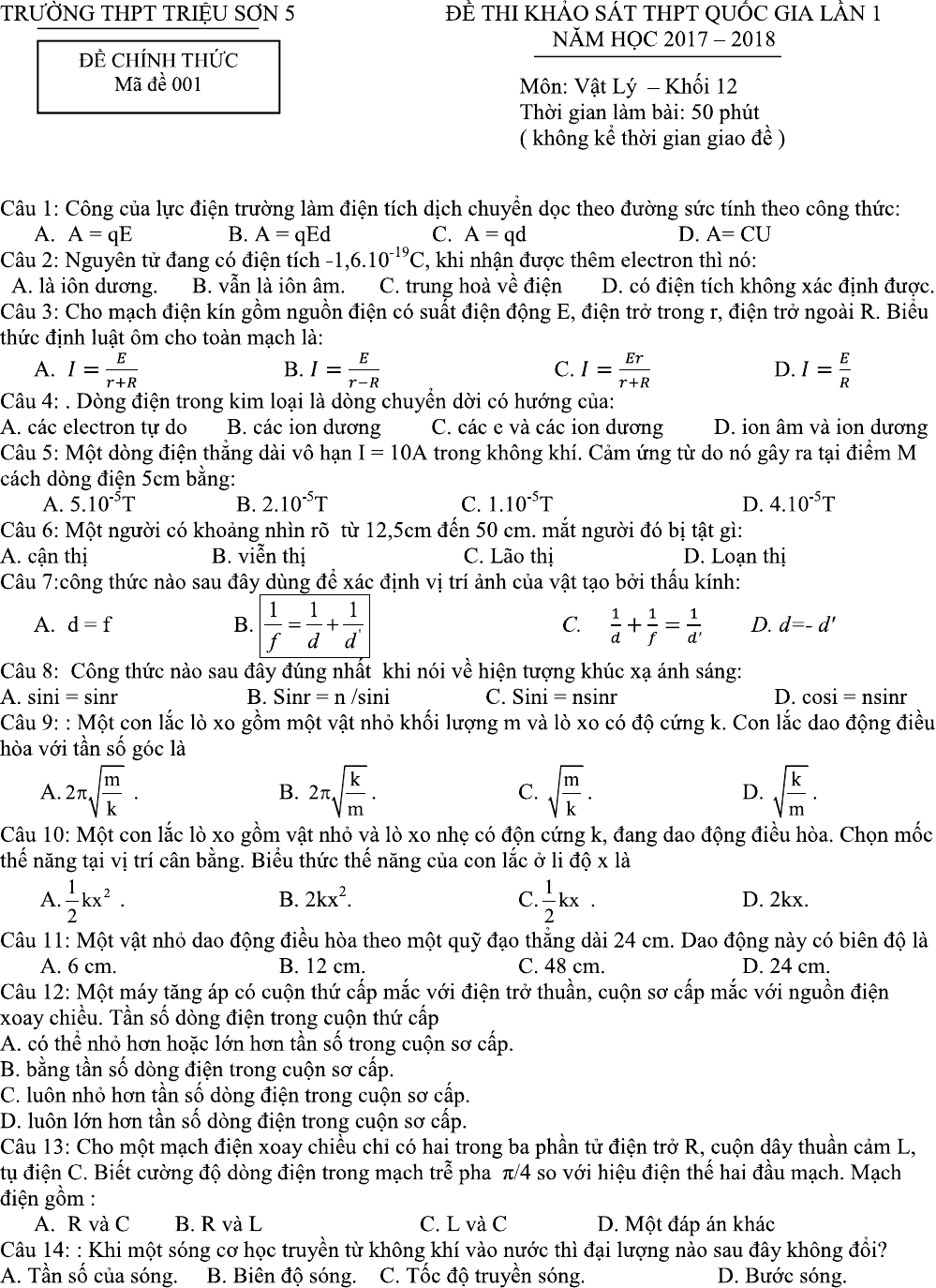 Đề thi thử THPT quốc gia môn Vật lý năm 2018 trường THPT Triệu Sơn 5 - Thanh Hóa