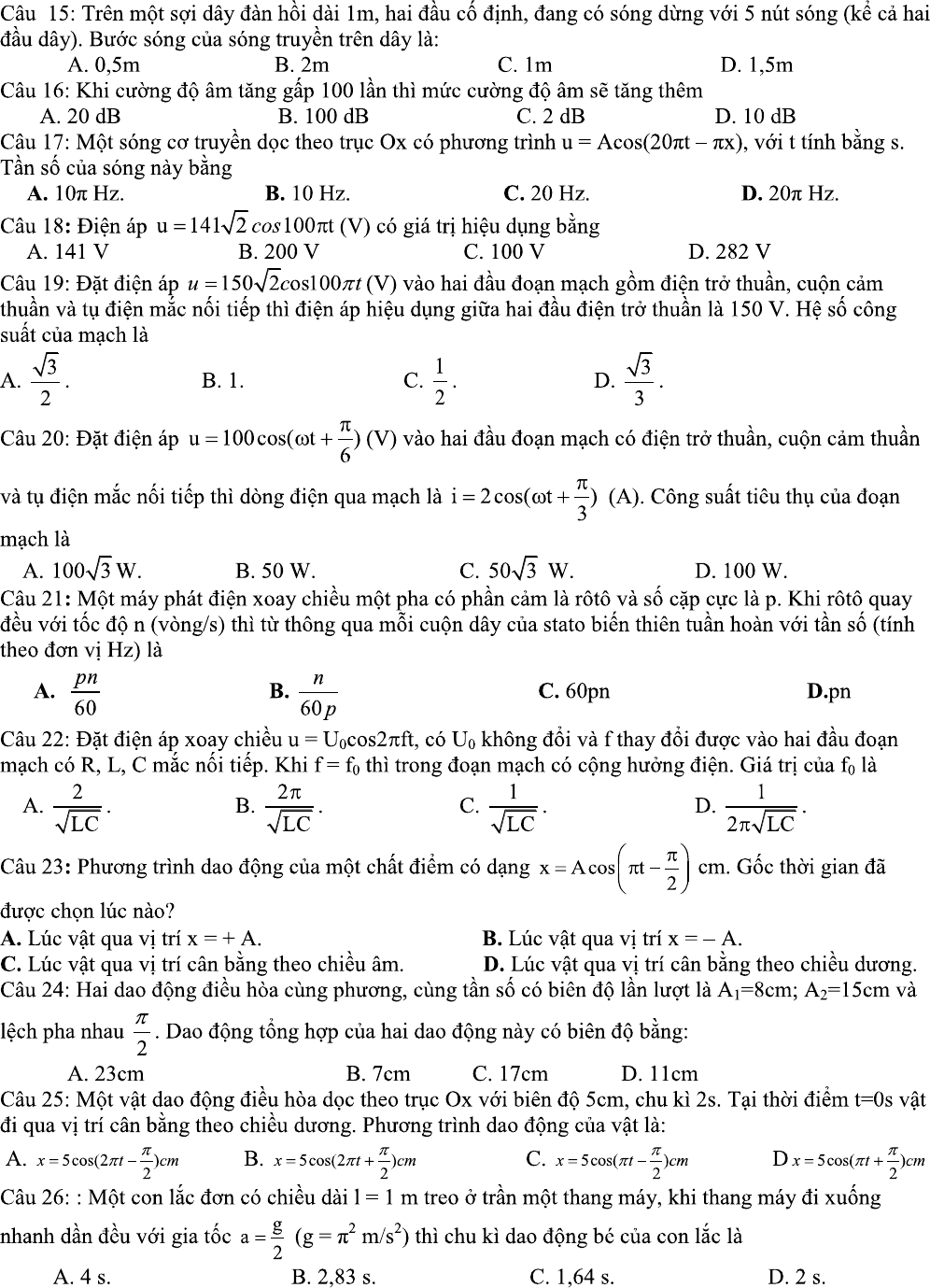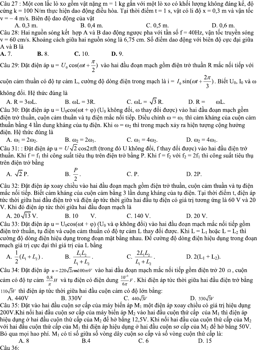 300 câu hỏi trọng tâm kiến thức Vật lý 12 có đáp án