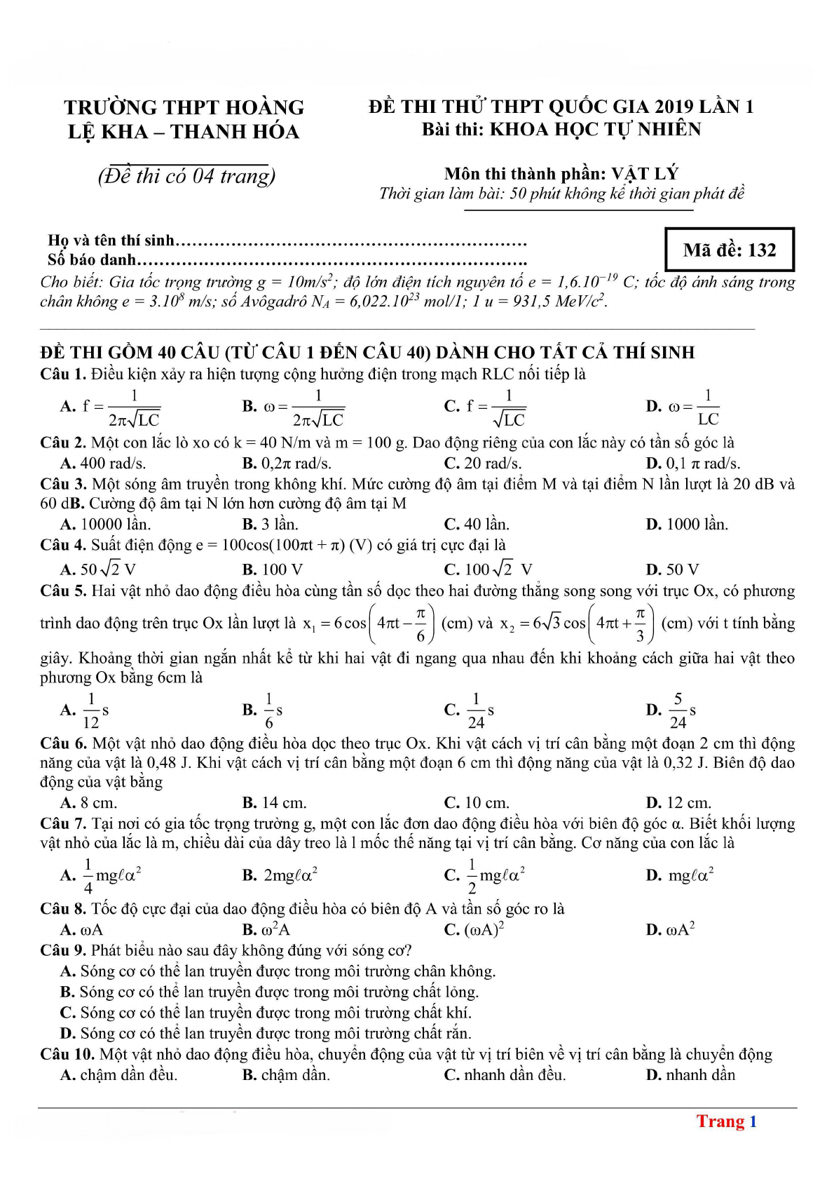 Đề thi thử THPT Quốc gia môn Vật lý năm 2019 trường THPT Hoàng Lệ Kha - Thanh Hóa lần 1