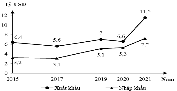 Theo biểu đồ, nhận xét nào sau đây đúng về sự thay đổi giá trị xuất khẩu, nhập khẩu năm 2021 so với năm