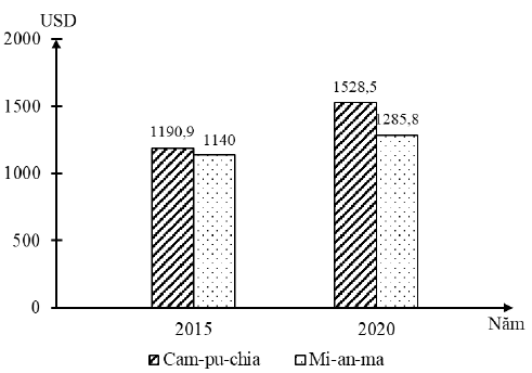 GDP BÌNH QUÂN ĐẦU NGƯỜI CỦA CAM-PU-CHIA VÀ MI-AN-MA NĂM 2015 VÀ 2020