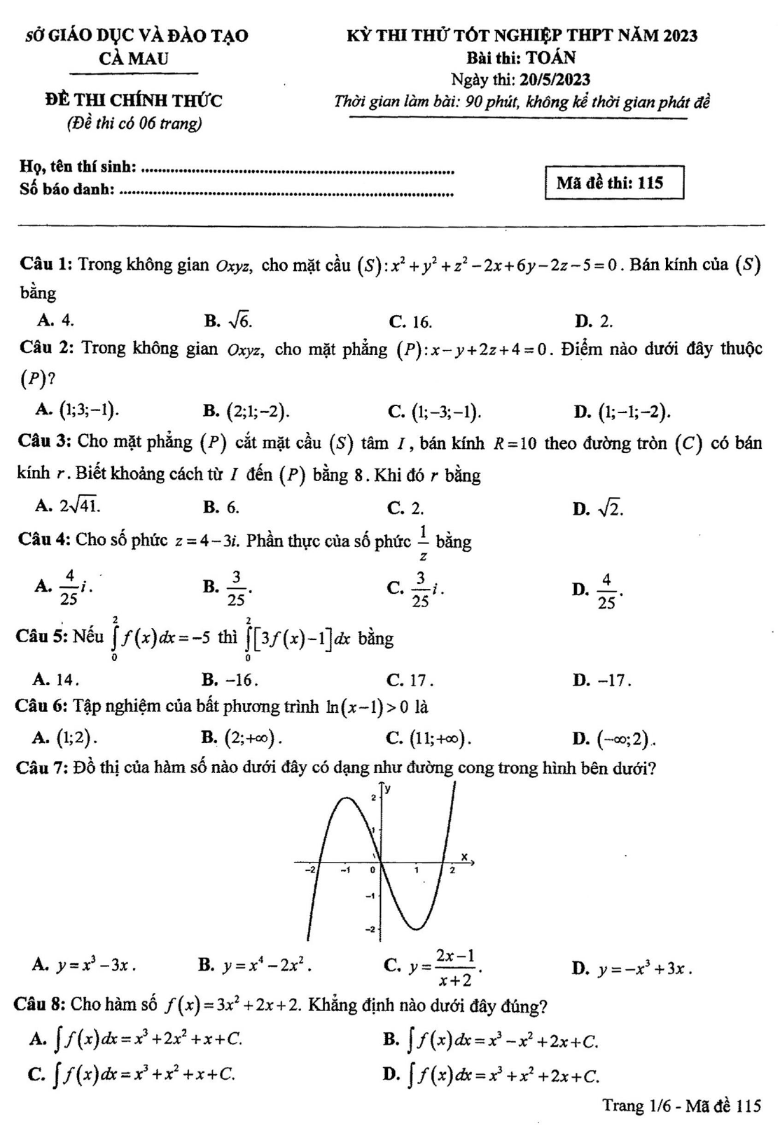 Đề thi thử tốt nghiệp THPT Quốc gia năm 2023 môn Toán Sở GD&ĐT Cà Mau