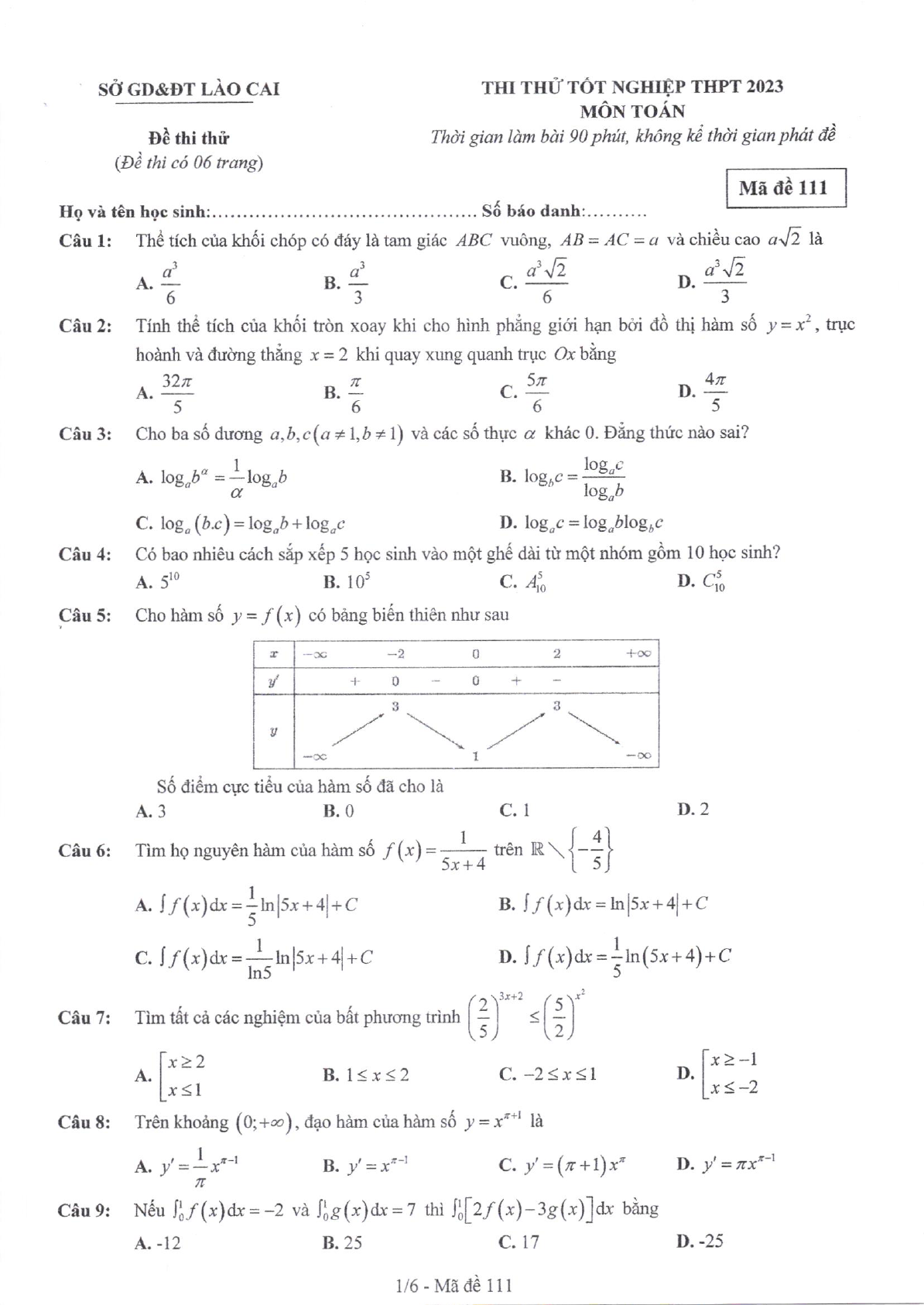Đề thi thử tốt nghiệp THPT Quốc gia năm 2023 môn Toán Sở GD&ĐT Lào Cai