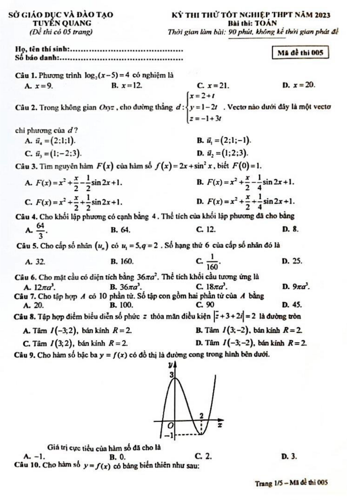 Đề thi thử tốt nghiệp THPT Quốc gia năm 2023 môn Toán Sở GD&ĐT Tuyên Quang