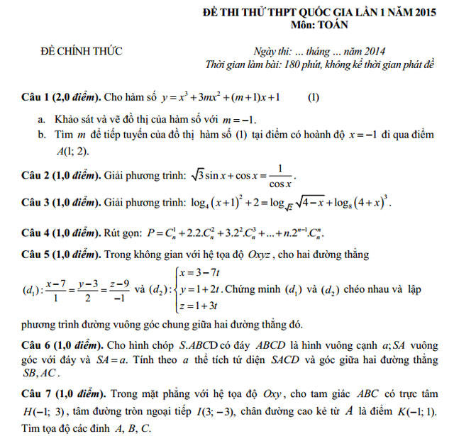 Đề thi thử Toán quốc gia lần 1 năm 2015