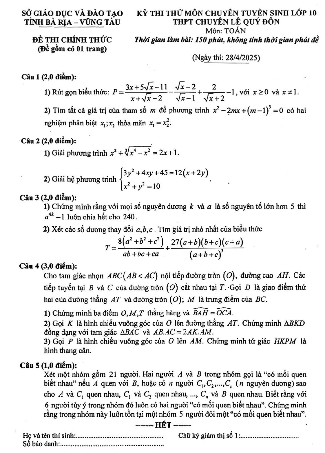 Đề thi thử Toán tuyển sinh lớp 10 trường chuyên Lê Quý Đôn, BR VT năm 2025 - 2026