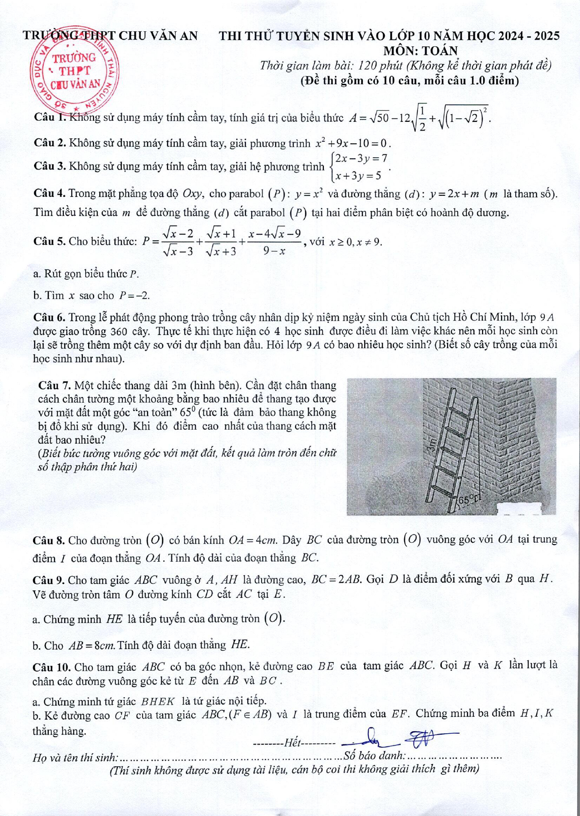 Đề thi thử Toán tuyển sinh lớp 10 trường THPT Chu Văn An, Thái Nguyên năm 2024 - 2025