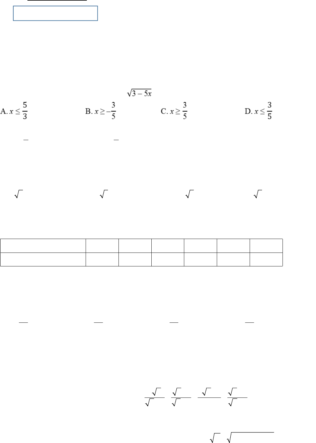 Câu 2. Điều kiện xác định của căn thức là: