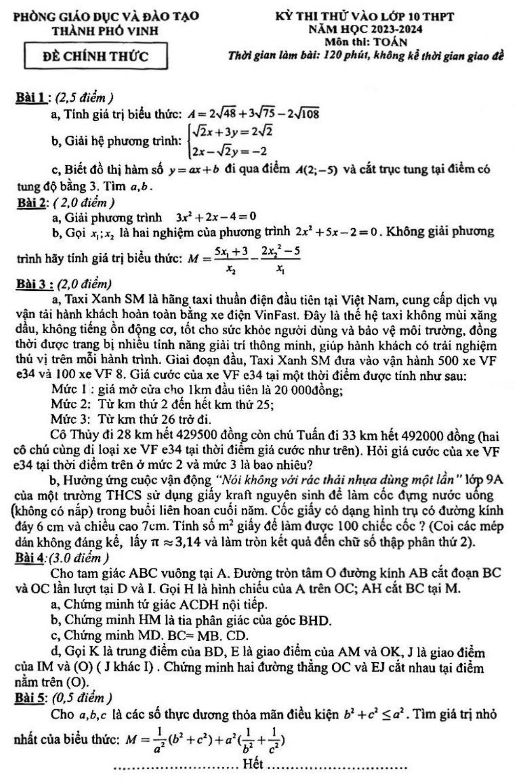 Đề thi thử vào lớp 10 môn Toán phòng GD&ĐT thành phố Vinh, Nghệ An năm 2023 - 2024