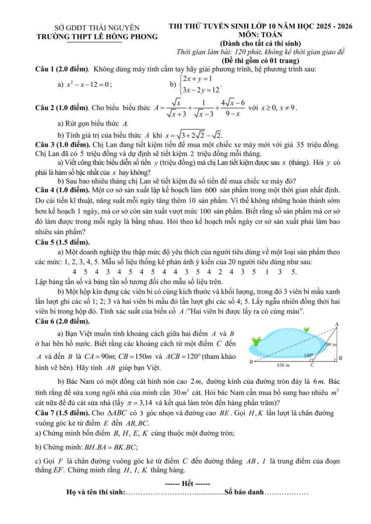 Đề thi thử Toán vào lớp 10 trường THPT Lê Hồng Phong, Thái Nguyên năm 2025 - 2026
