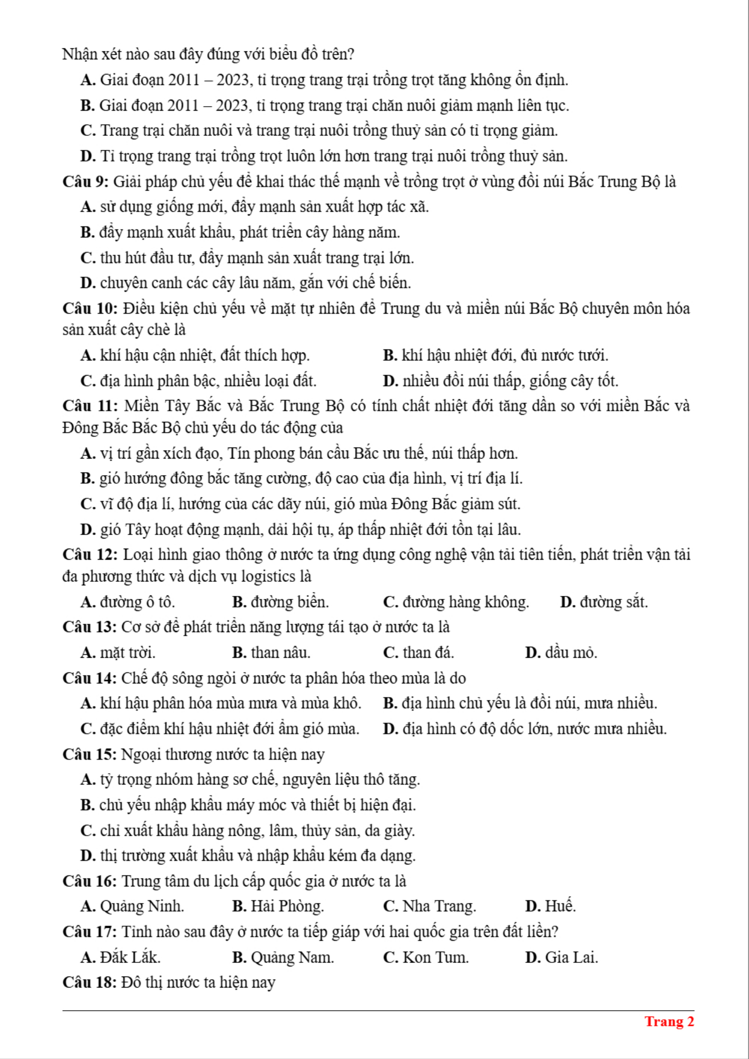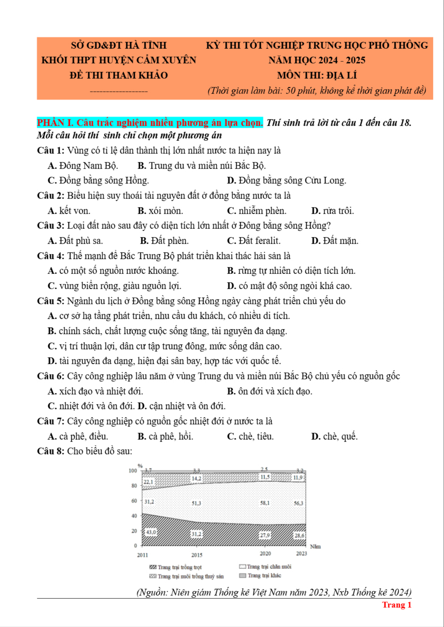 Đề thi thử tốt nghiệp môn Địa khối THPT Cẩm Xuyên, Hà Tĩnh