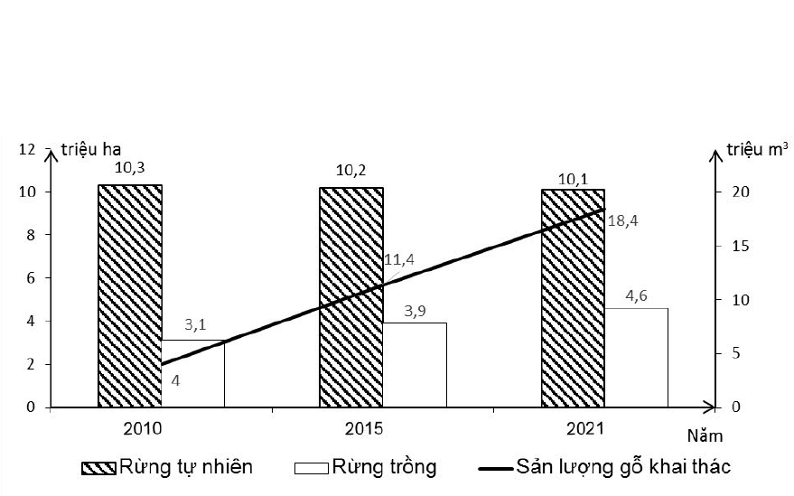 Biểu đồ diện tích rừng và sản lượng gỗ khai thác của nước ta giai đoạn 2010 – 2021