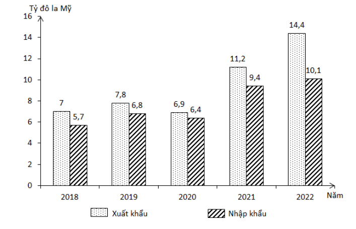 d) Năm 2022 so với năm 2018, nhập khẩu tăng nhanh hơn xuất khẩu.