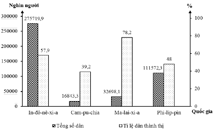 Câu 1: Cho biểu đồ về tổng số dân và và tỉ lệ dân thành thị của một số quốc gia Đông Nam Á năm 2022