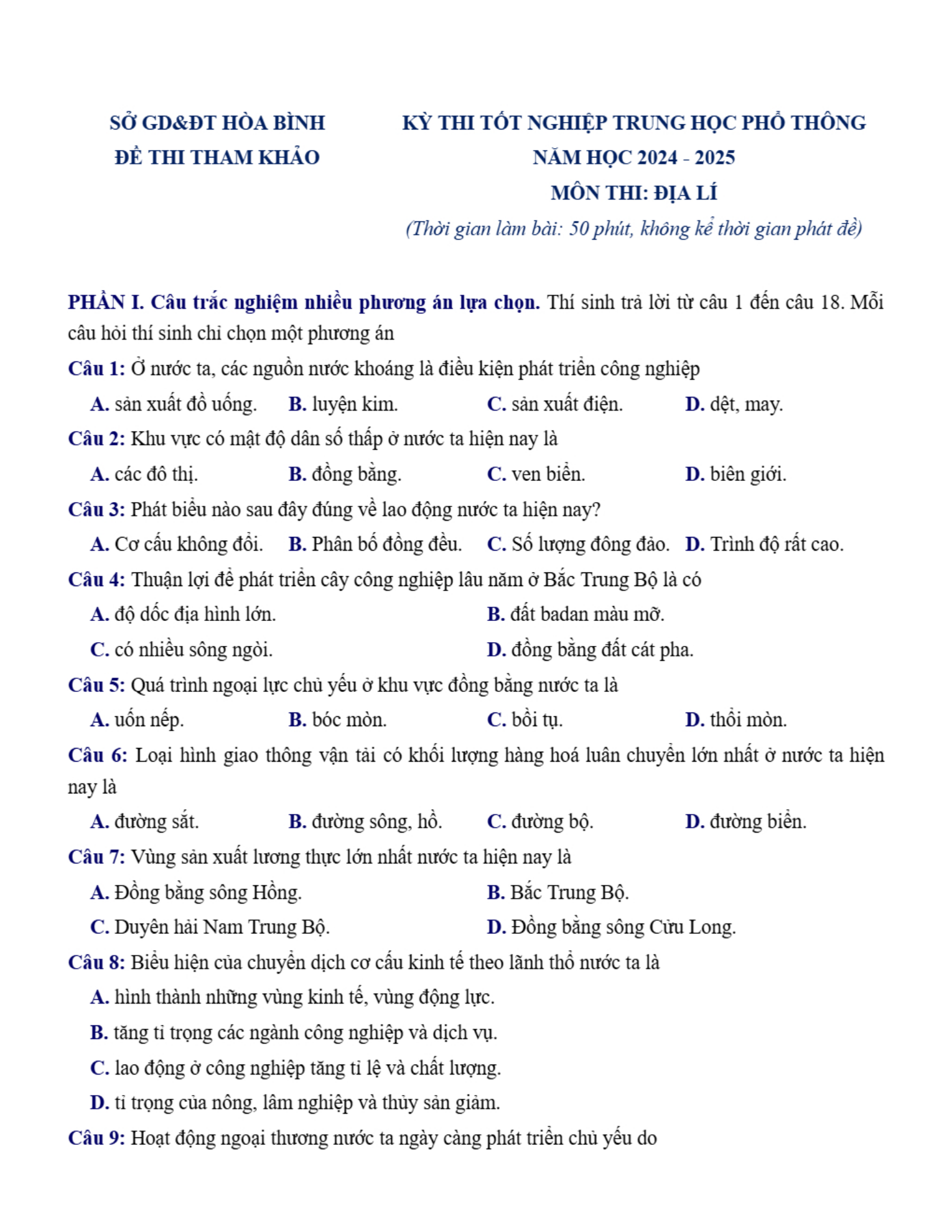 Đề thi thử tốt nghiệp THPT 2025 môn Địa lí Sở GD&ĐT Hòa Bình