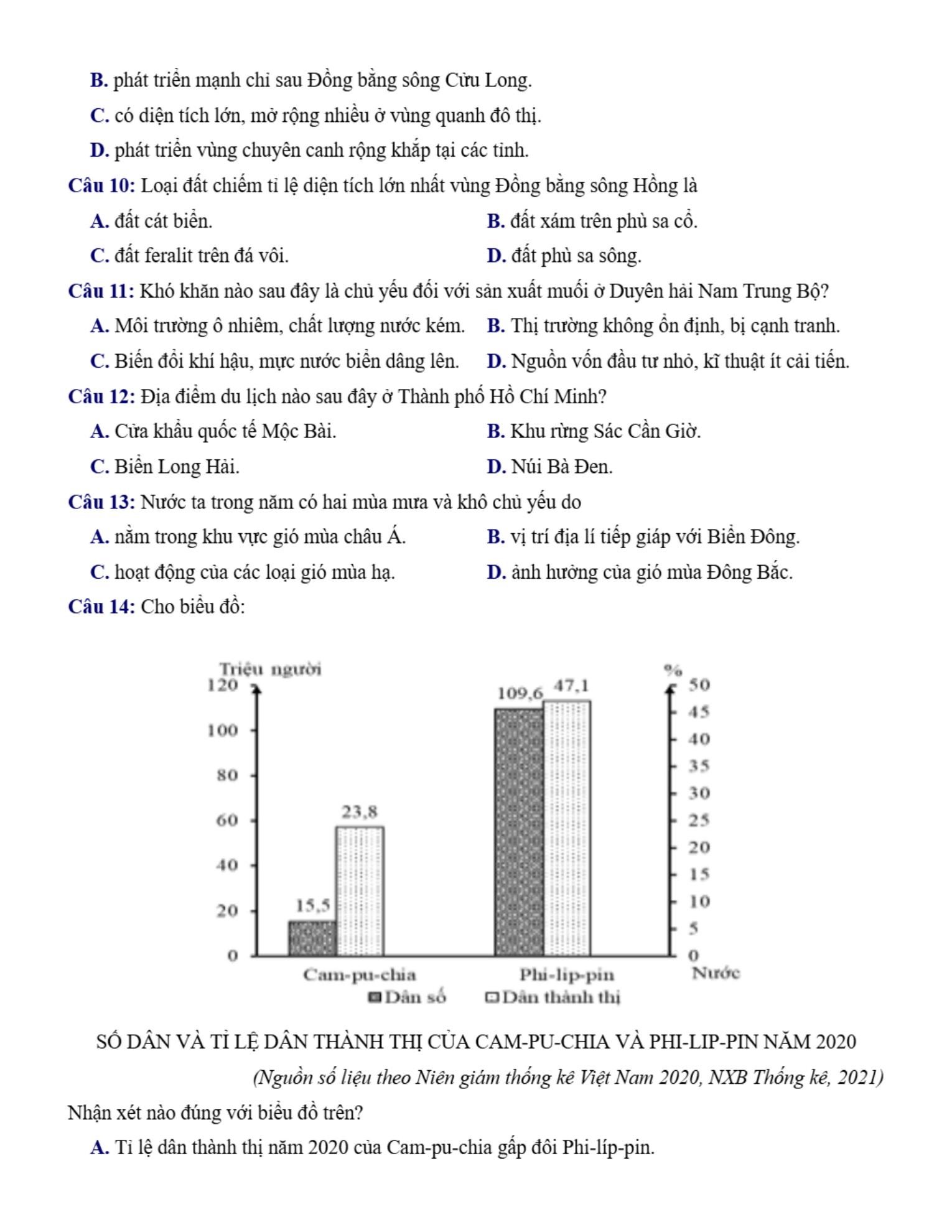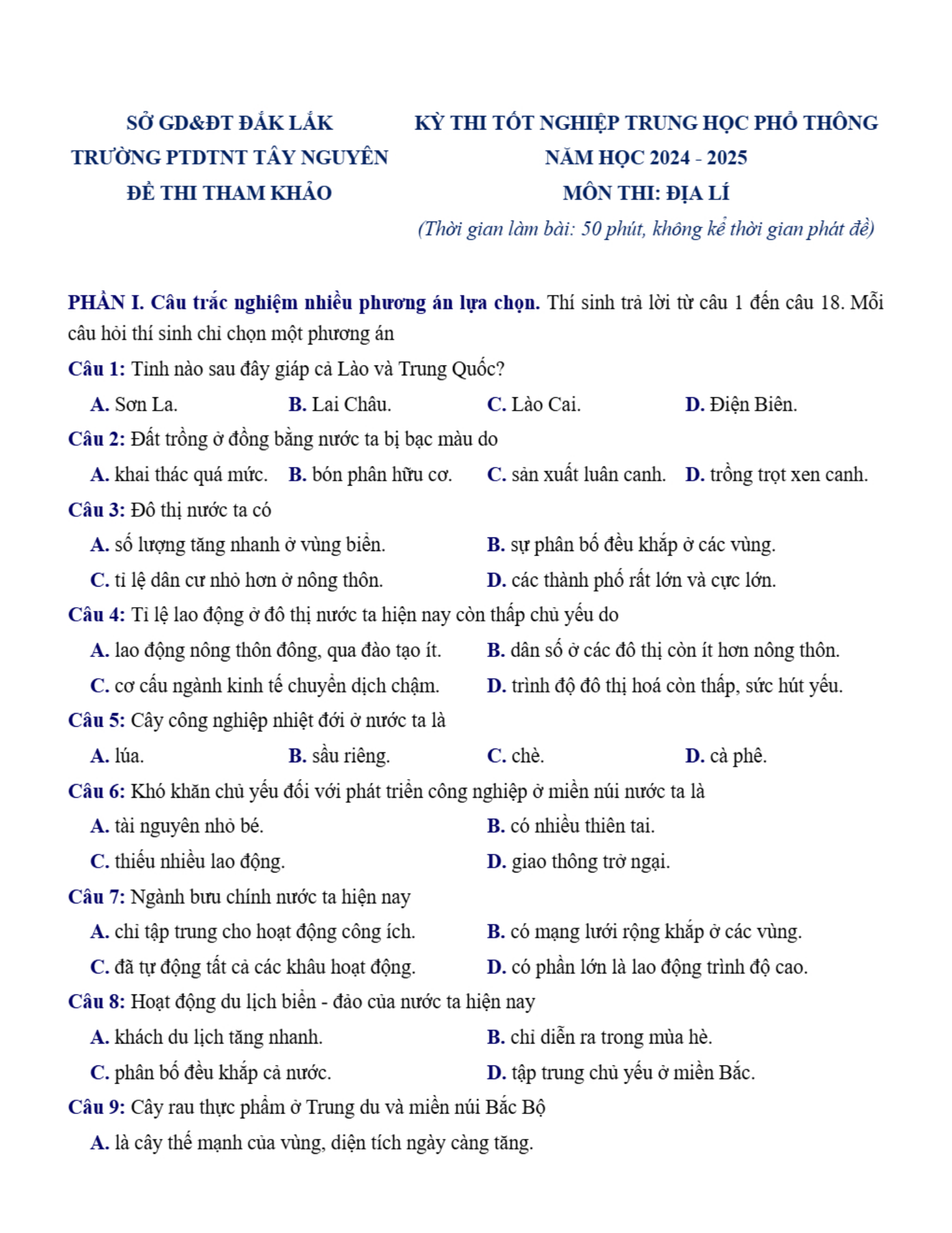 Đề thi thử tốt nghiệp môn Địa trường PTDTNT Tây Nguyên, Đắk Lắk