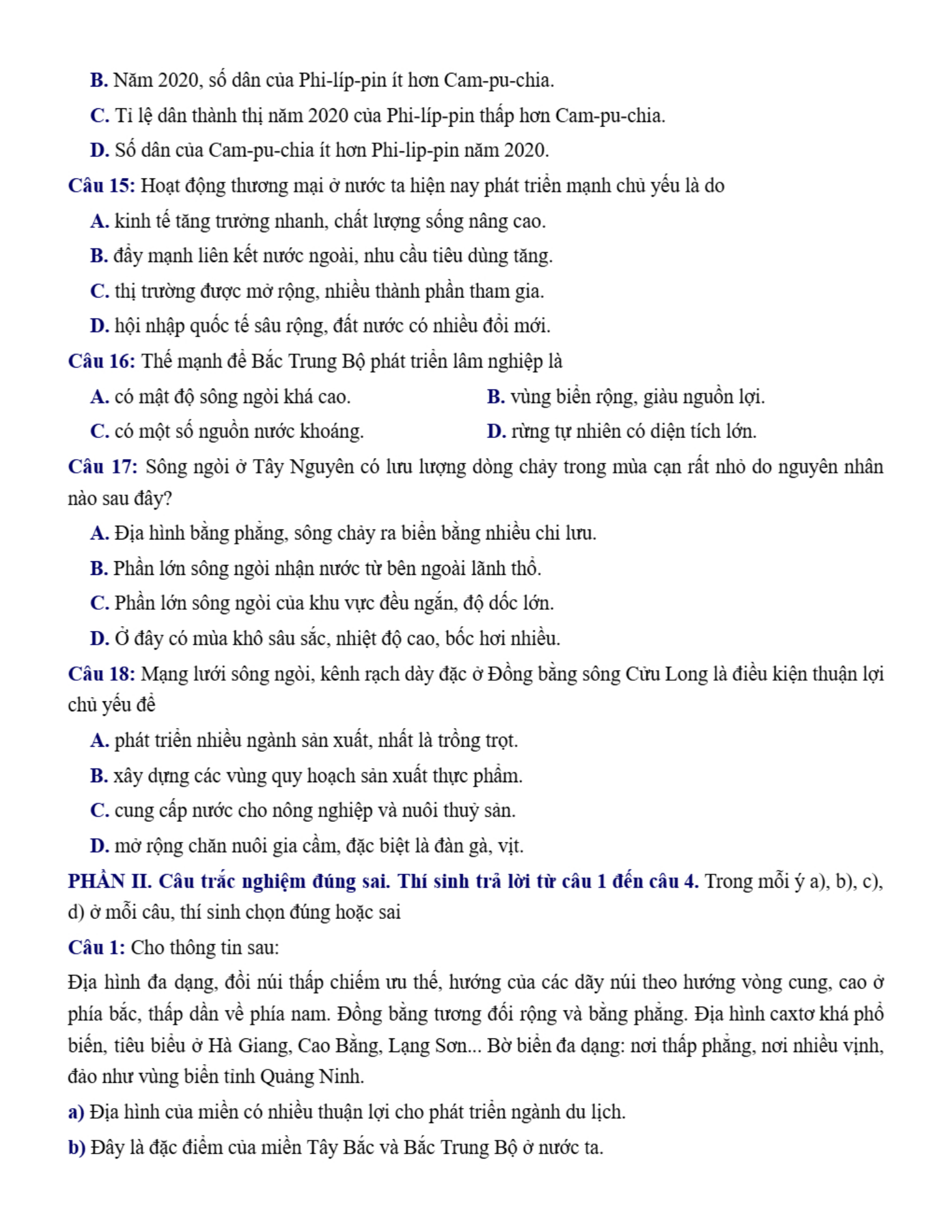 Đề thi thử tốt nghiệp THPT Quốc gia 2025 môn Địa lí trường PTDTNT Tây Nguyên, Đắk Lắk có đáp án là tài liệu hữu ích giúp bạn đọc có thể trau dồi, luyện tập nội dung kiến thức, chuẩn bị thật tốt cho kì Thi THPT Quốc gia sắp tới nhé. Đề thi được biên soạn theo cấu trúc đề thi mới. Đề thi gồm có 18 câu hỏi trắc nghiệm, 4 câu hỏi đúng sai và 6 câu hỏi trả lời ngắn. Thí sinh làm bài trong thời gian 50 phút. Mời các bạn cùng theo dõi đề thi dưới đây.