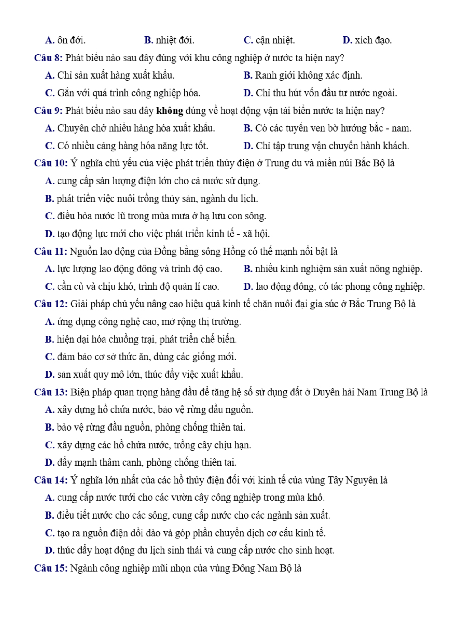 Đề thi thử tốt nghiệp môn Địa trường Vĩnh Yên, Vĩnh Phúc