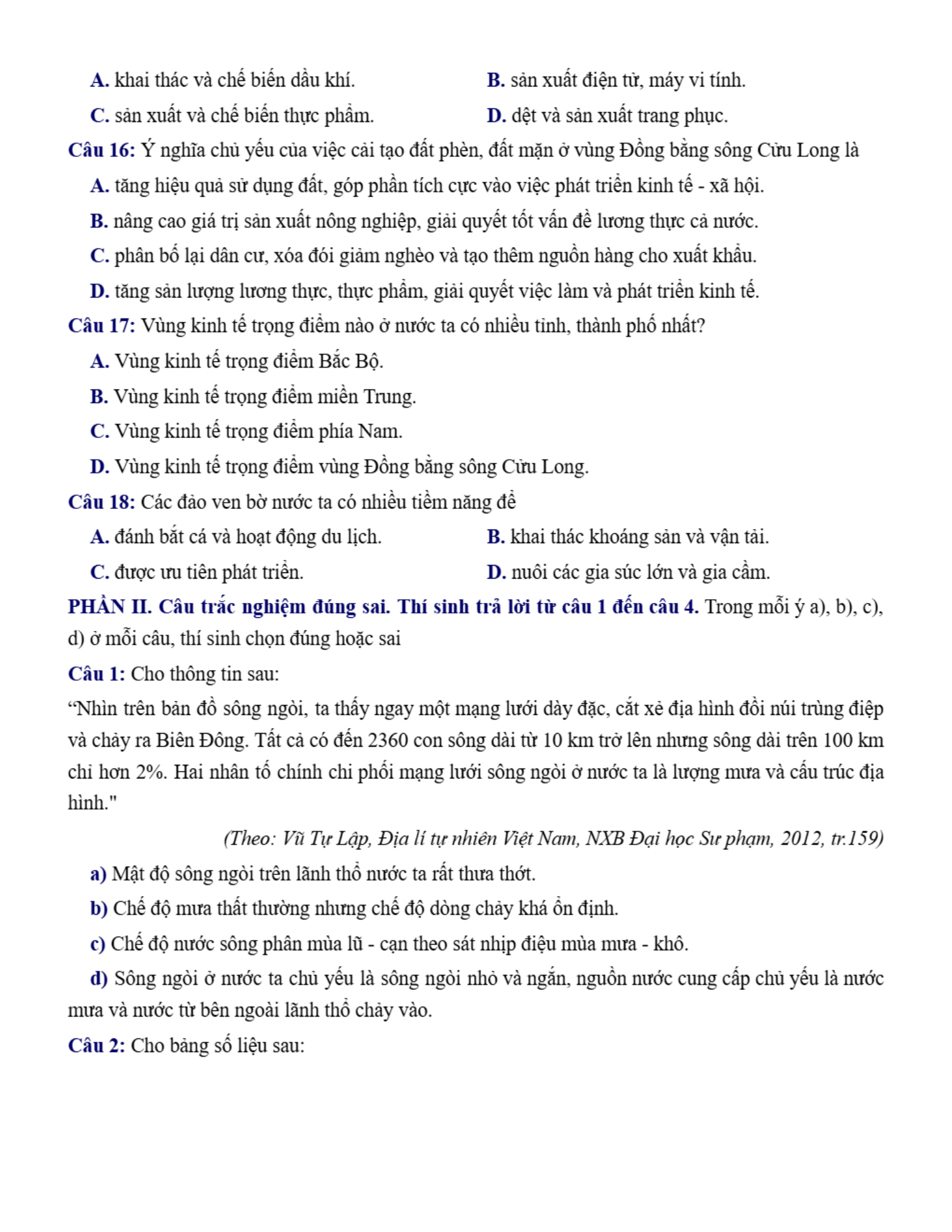 Đề thi thử tốt nghiệp THPT Quốc gia 2025 môn Địa lí trường THPT Vĩnh Yên, Vĩnh Phúc có đáp án là tài liệu hữu ích giúp bạn đọc có thể trau dồi, luyện tập nội dung kiến thức, chuẩn bị thật tốt cho kì Thi THPT Quốc gia sắp tới nhé. Đề thi gồm có 18 câu hỏi trắc nghiệm, 4 câu hỏi đúng sai và 6 câu hỏi trả lời ngắn. Thí sinh làm bài trong thời gian 50 phút. Mời các bạn cùng theo dõi đề thi dưới đây.
