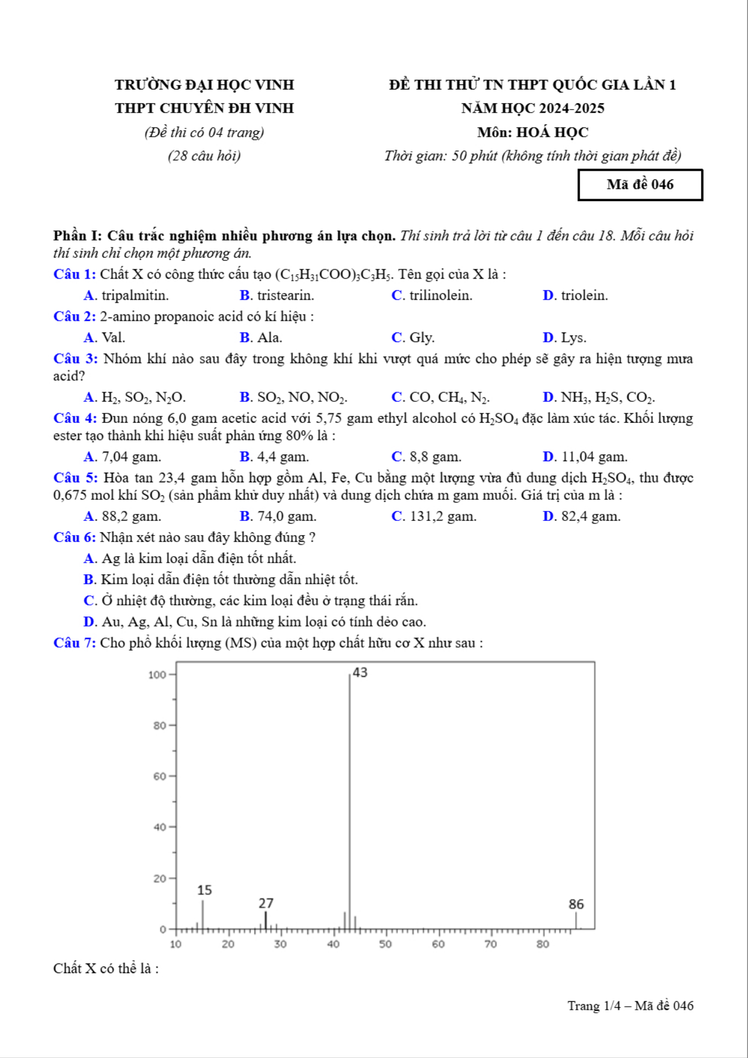 Đề thi thử tốt nghiệp THPT 2025 môn Hóa lần 1 trường THPT Chuyên Đại học Vinh